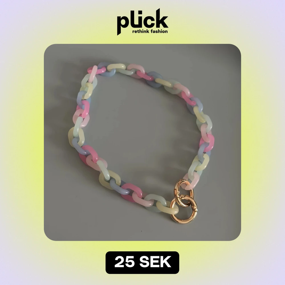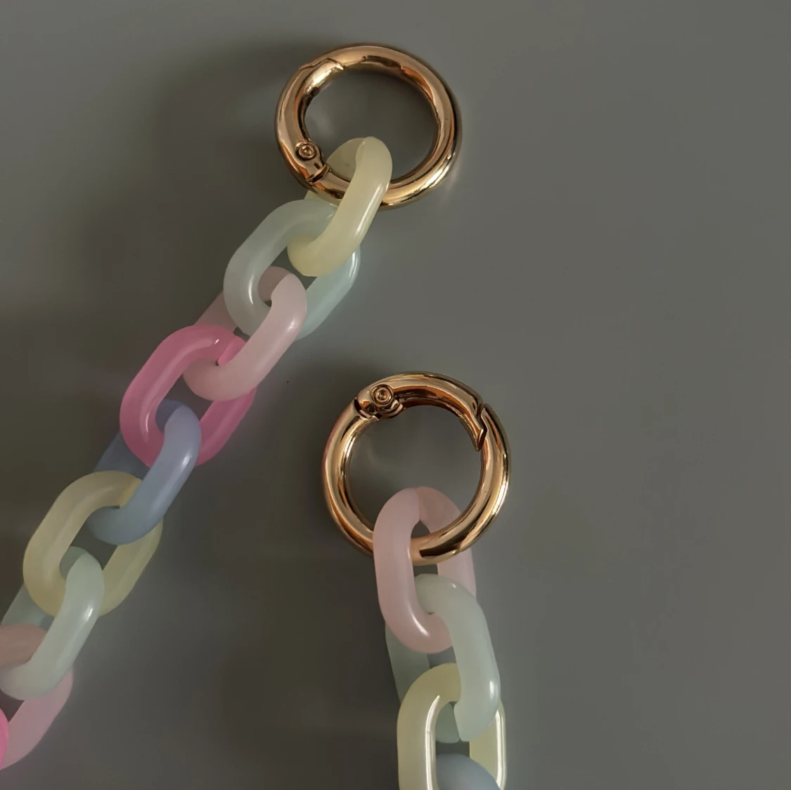 Egentligen kan man väll använda det till vad man vill. Det är en tjockare pastell kedja med guldig klammer som man kan lägga på väskor, använda som halsband eller nyckelkedja. Total längden är 44cm så kanske inte går att använda på axelväskor