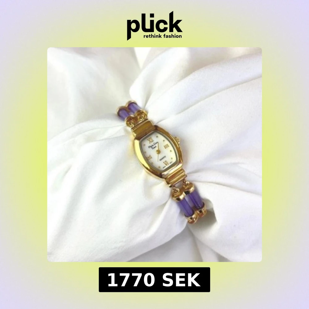 Snygg klocka från Calypso Studios med ett armband i lila, grönt och rött. Klockan är i guld och urtavlan är vit med romerska siffror. Säljer eftersom den jag behöll är väldigt lik :)
