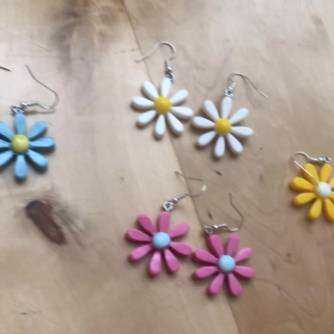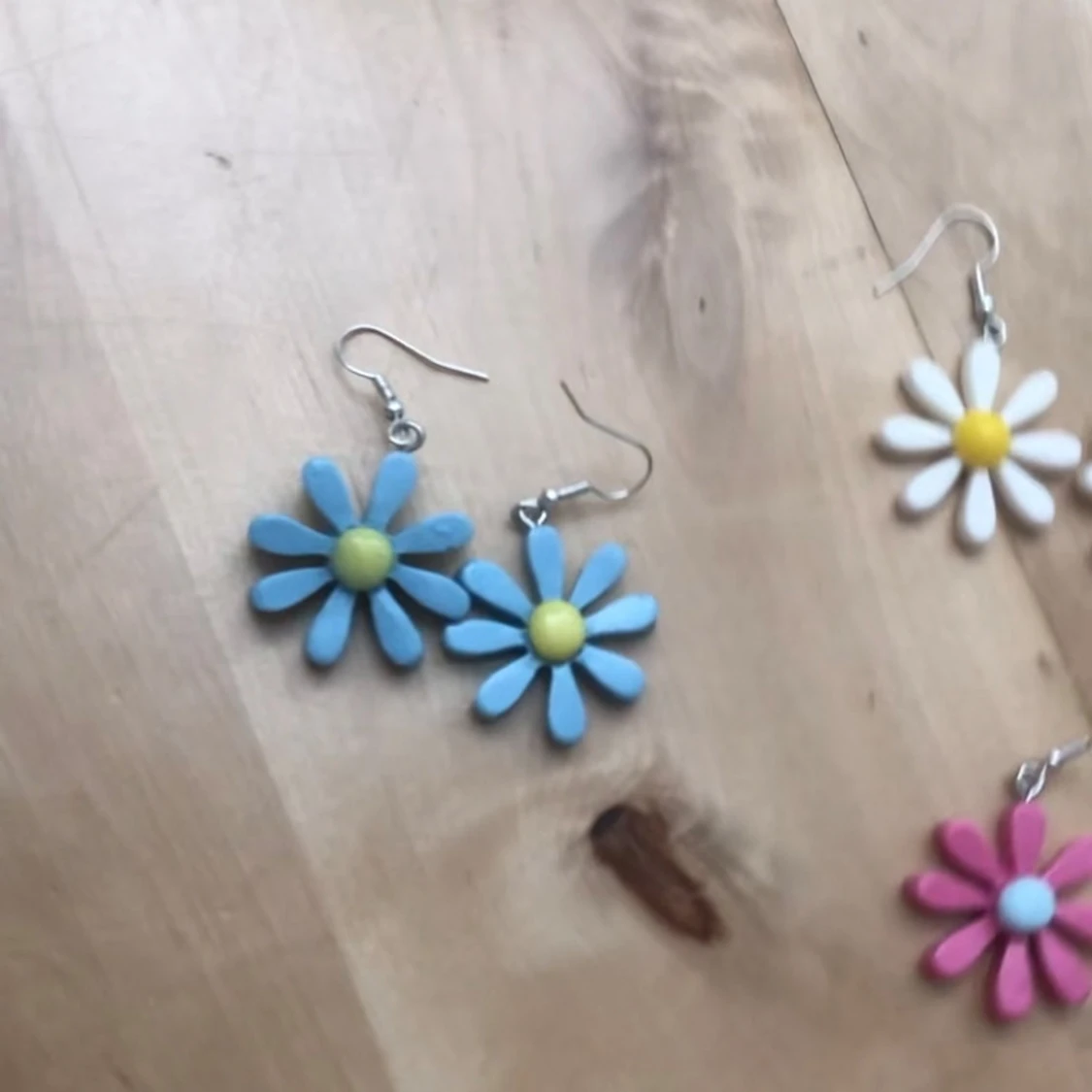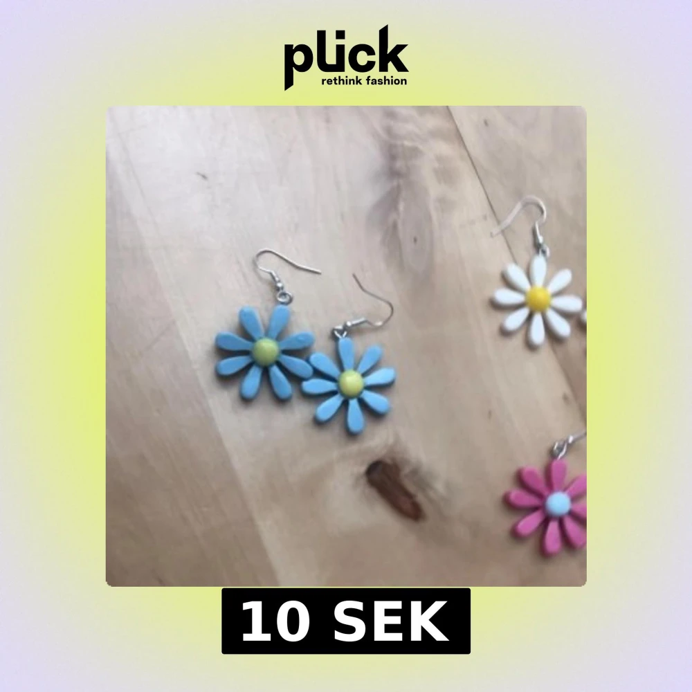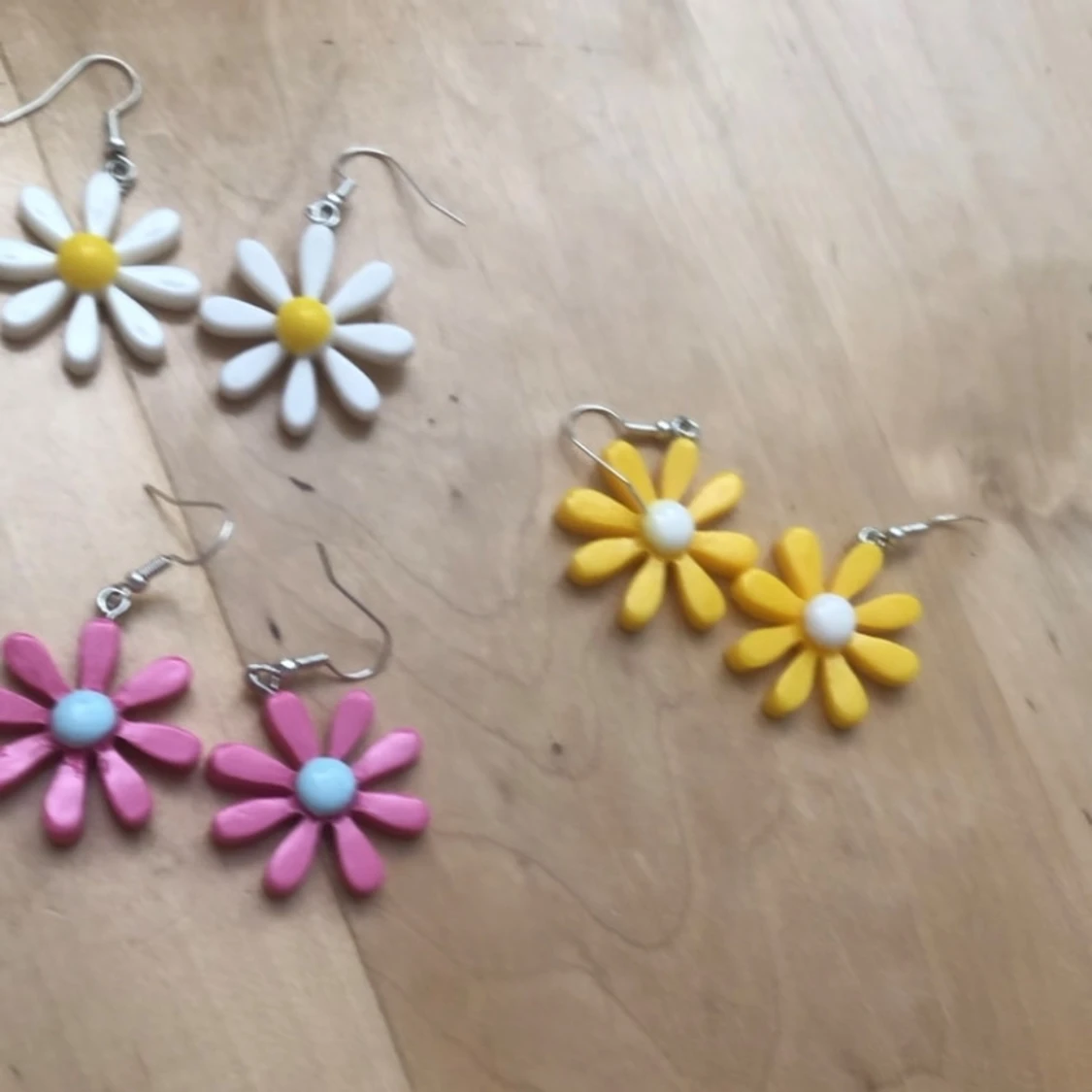 Säljer flera par örhängen i form av stora blommor i olika färger: blå med gul mitt, vita med gul mitt, rosa med ljusblå mitt och gula med vit mitt. Perfekta för dig som vill sticka ut med ett lekfullt och färgstarkt smycke. Krokar i metall och priset gäller för ett par örhängen. Jag har ett par av alla örhängen förutom de vita med gul mitt (2 par) och de gula med vit mitt (2 par)💞
