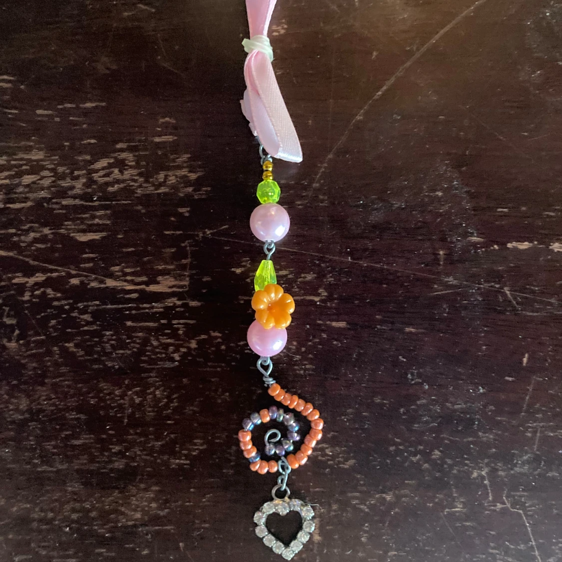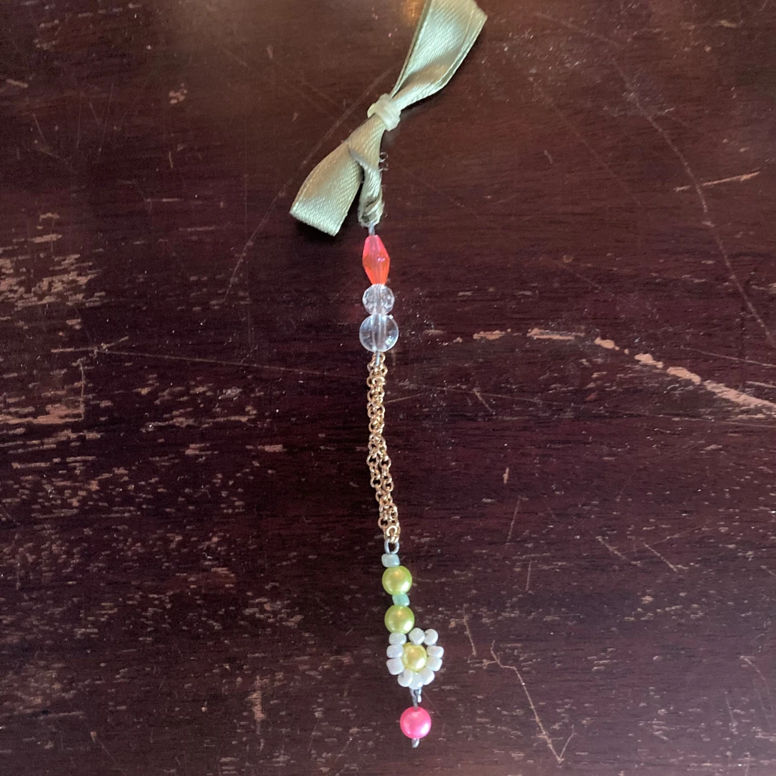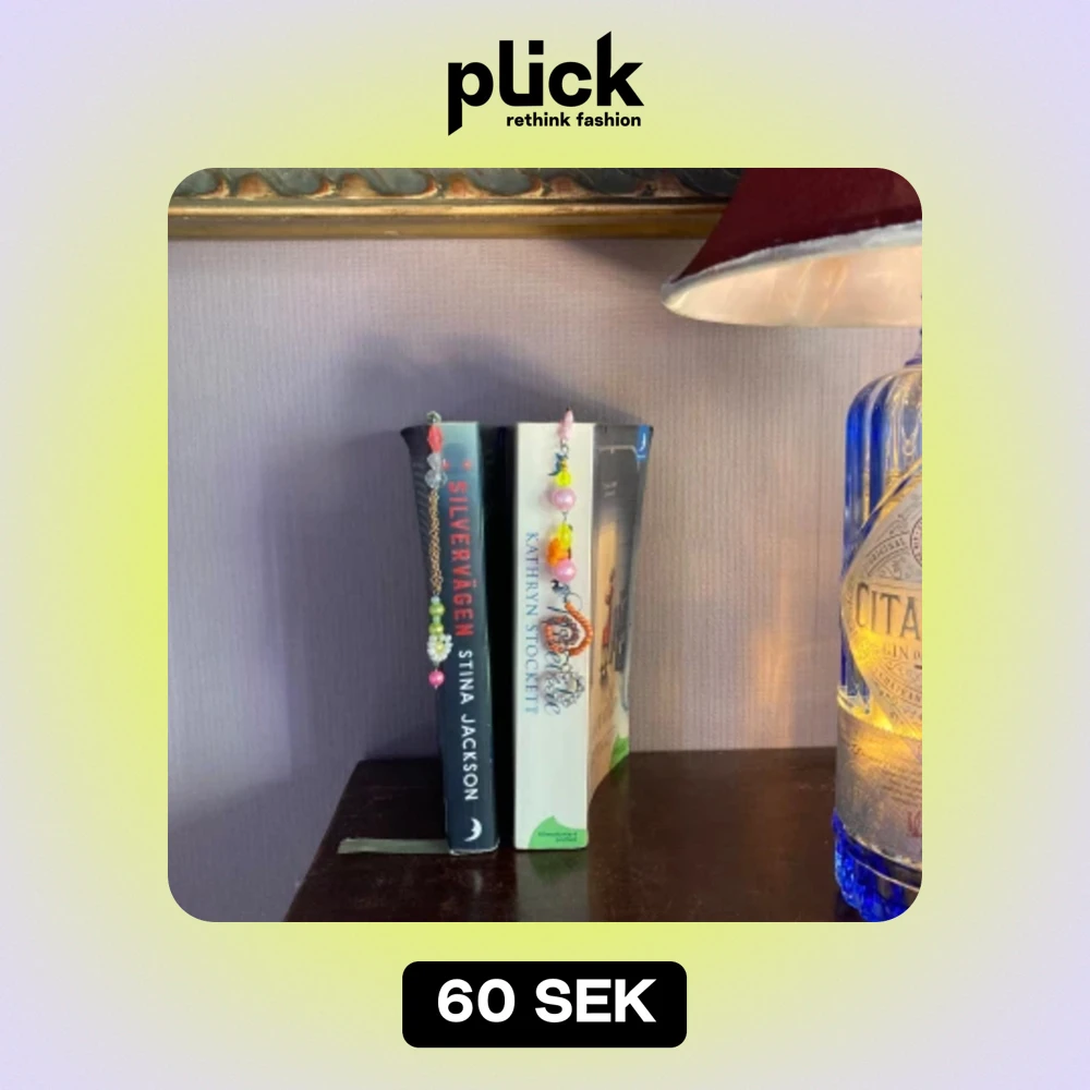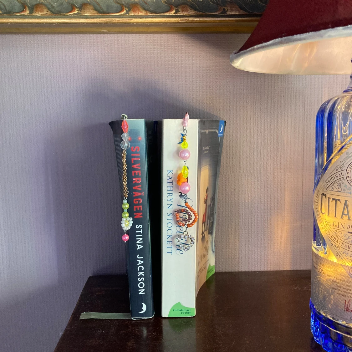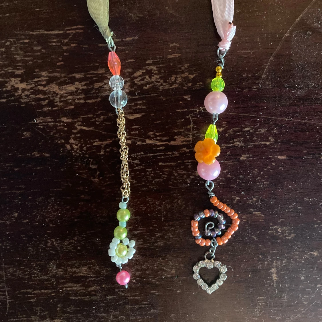 Säljer två superfina och färgglada bokmärken med pärlor och band. Det ena bokmärket har ett grönt band med en kedja och pärlor i olika färger som avslutas med en liten blomma och en rosa pärla. Det andra bokmärket har ett rosa band med pärlor i grönt, rosa och orange, samt en liten hjärtformad berlock längst ner. Perfekta för att hålla koll på var du är i din favoritbok!
