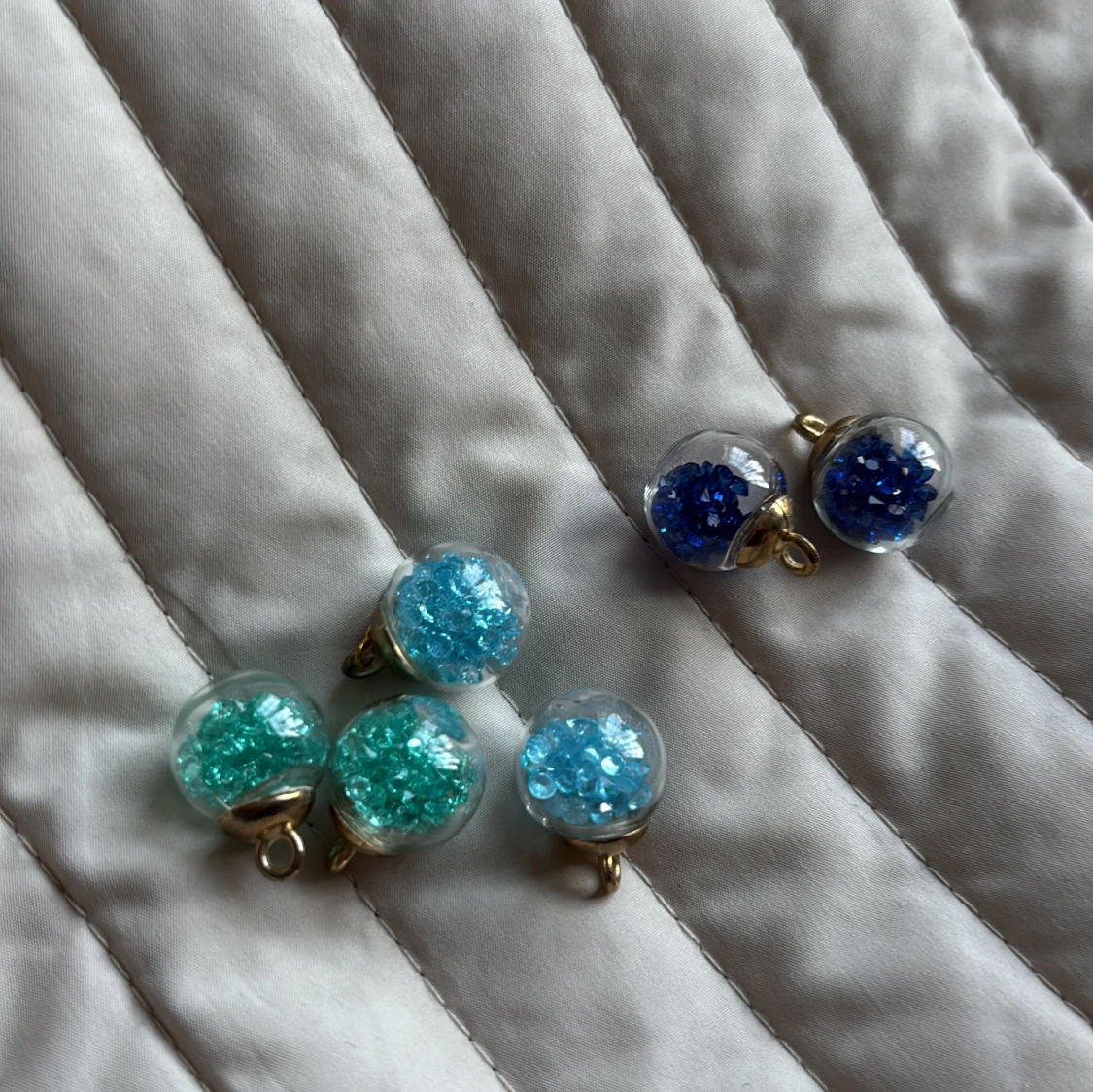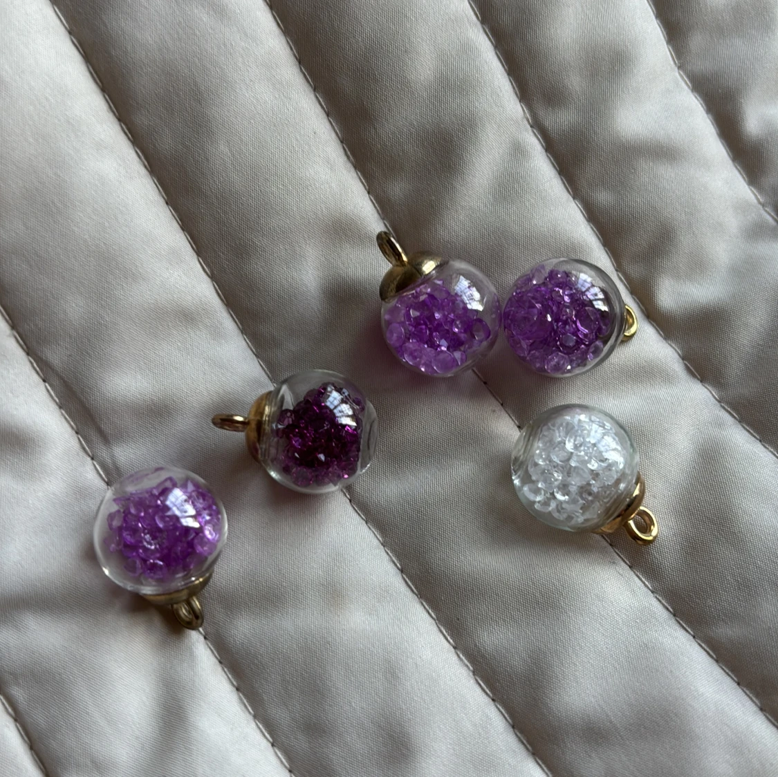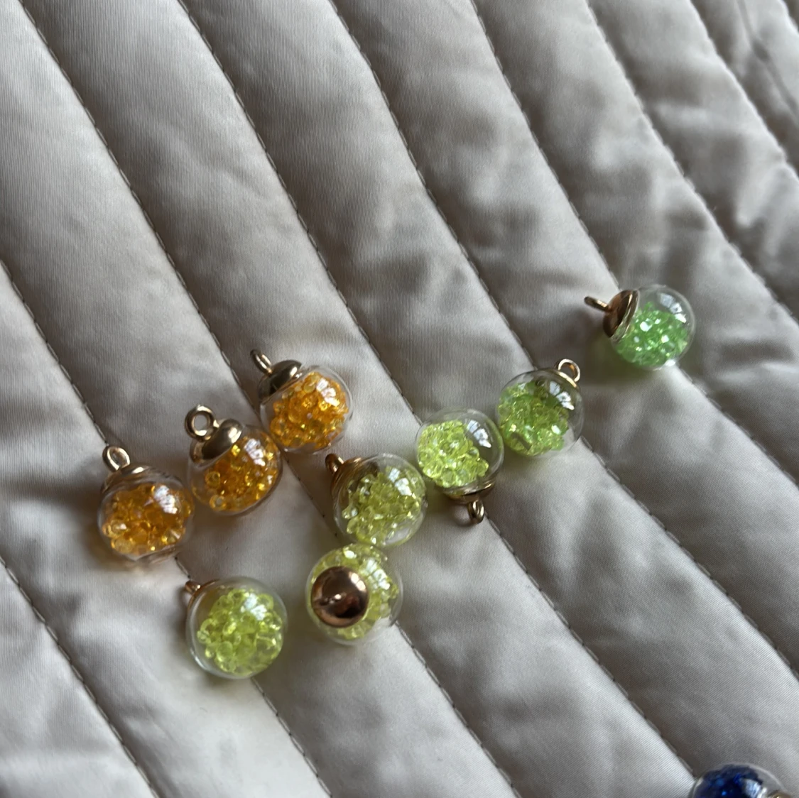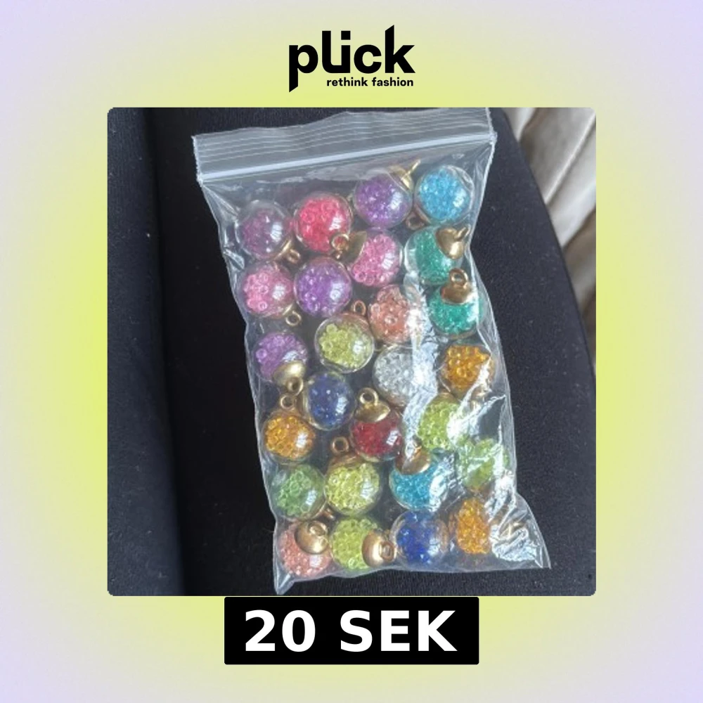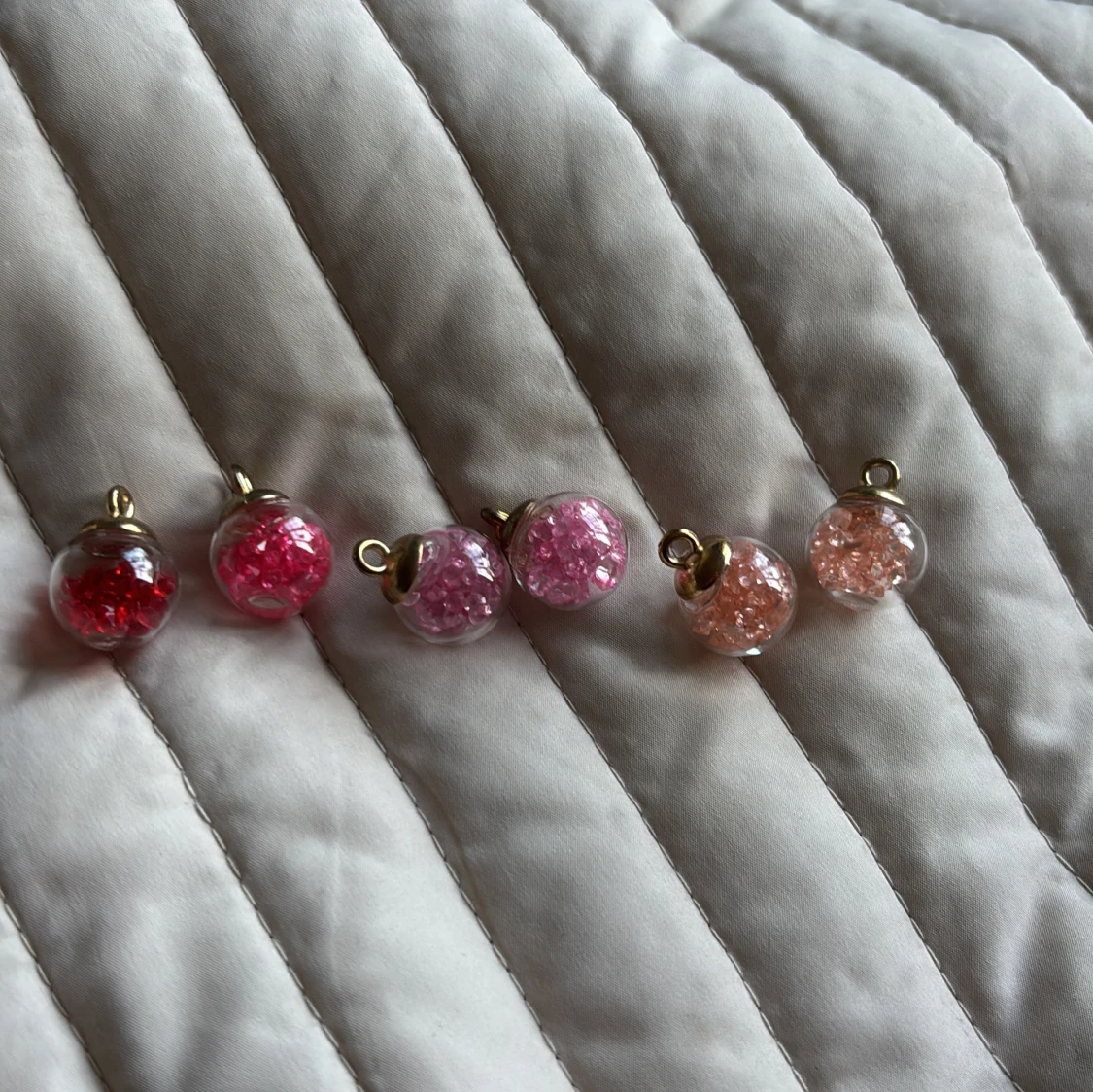 Säljer ett gäng runda berlocker i transparent plast med glittriga pärlor inuti. Finns i flera färger som rosa, blå, grön, gul, lila och röd, med guldfärgade detaljer upptill. Perfekt för att göra egna halsband, armband eller örhängen. Superfina att mixa och matcha för en personlig stil!