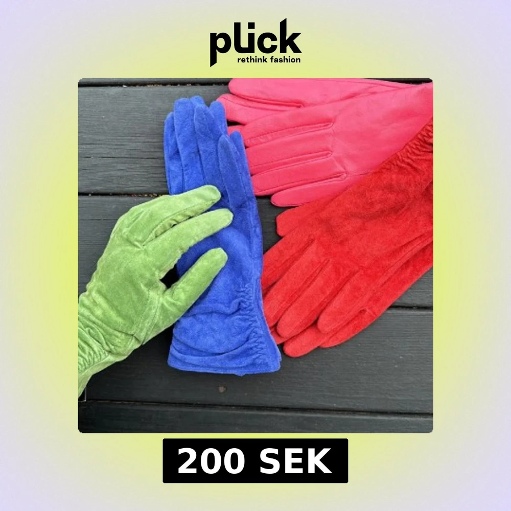 3 par handskar i olika färge sälj per styck ( grön är slut ) kvar klarblå mocka, ett par i röd mocka och ett par i rosa skinn. Handskarna har klassisk form med lätt rynkning vid handleden och slät yta. Perfekt för dig som vill sticka ut med färg på vintern.