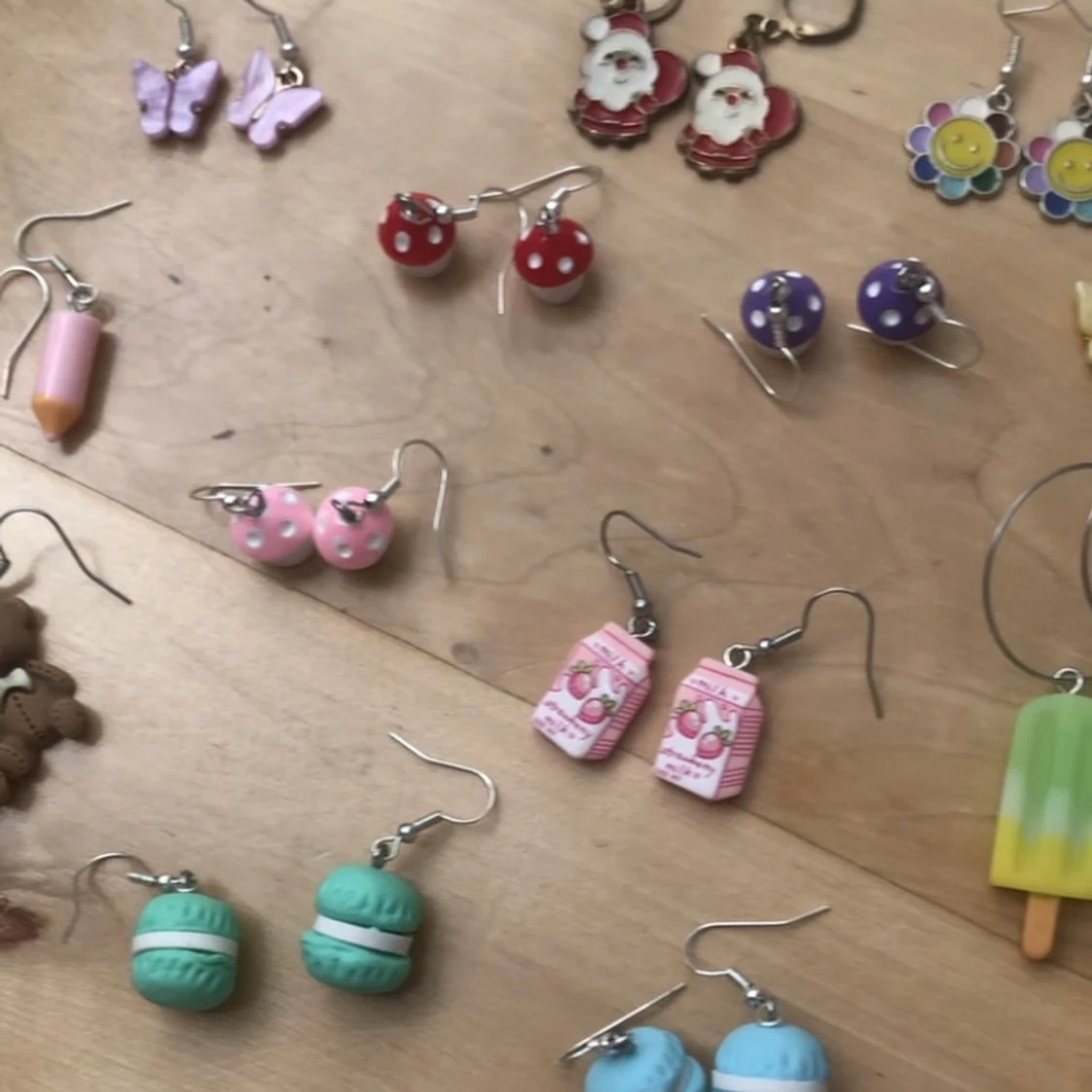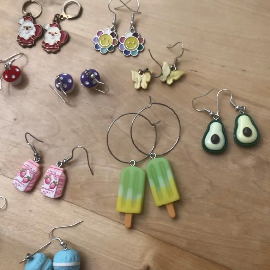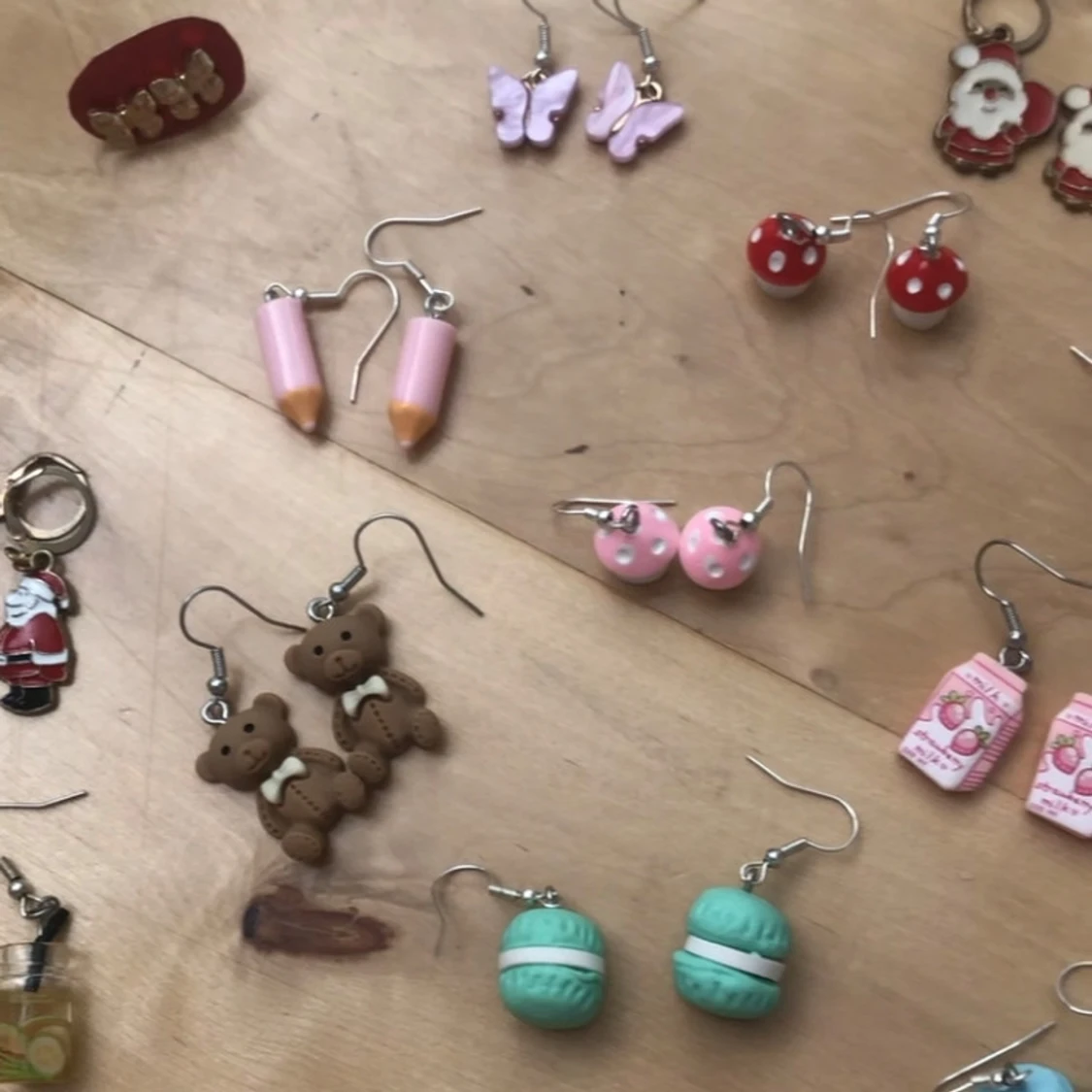 Samling med unika örhängen i olika former som björnar, fjärilar, avokado, glass, macarons, svampar, pennor, blommor, tomtar och mjölkpaket. Färgerna är bland annat rosa, lila, grön, gul, brun, blå och röd. Perfekt för dig som vill ha lekfulla och kreativa accessoarer. Det finns ett par av varje örhänge förutom de rosa svamparna (2 par) och avokadosarna (2 par)💞Priset gäller för ett par örhängen! Man kan även köpa alla (20 par) örhängen för 35kr💞