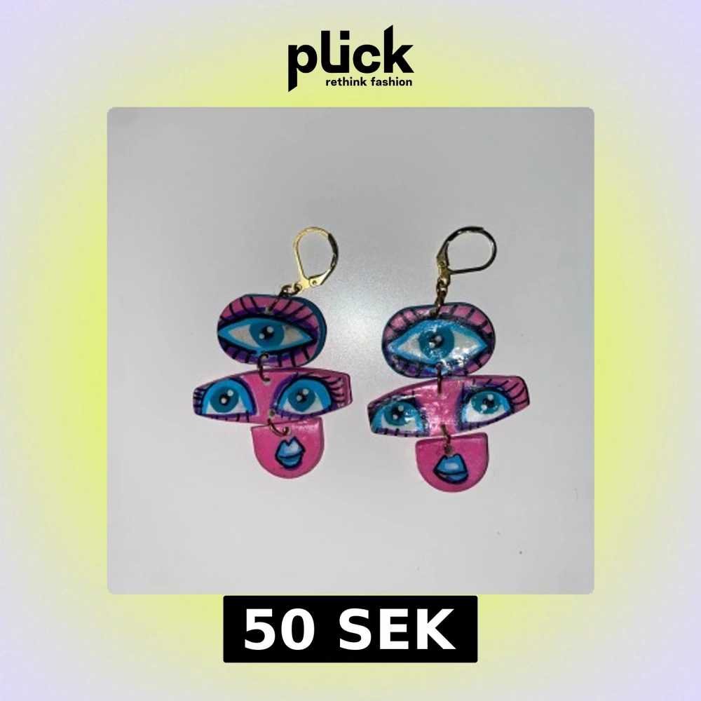 Unika och färgglada örhängen med ögonmotiv i blått och rosa. De har en lekfull design med flera ögon och läppar, och är fästa med guldfärgade krokar. Perfekta för att ge en konstnärlig touch till din stil.