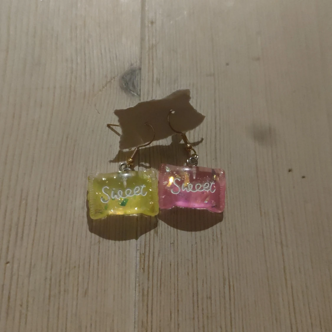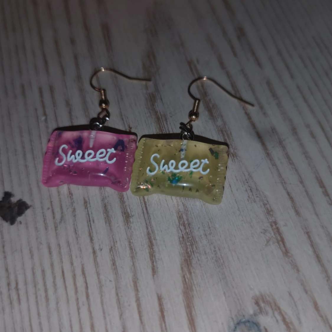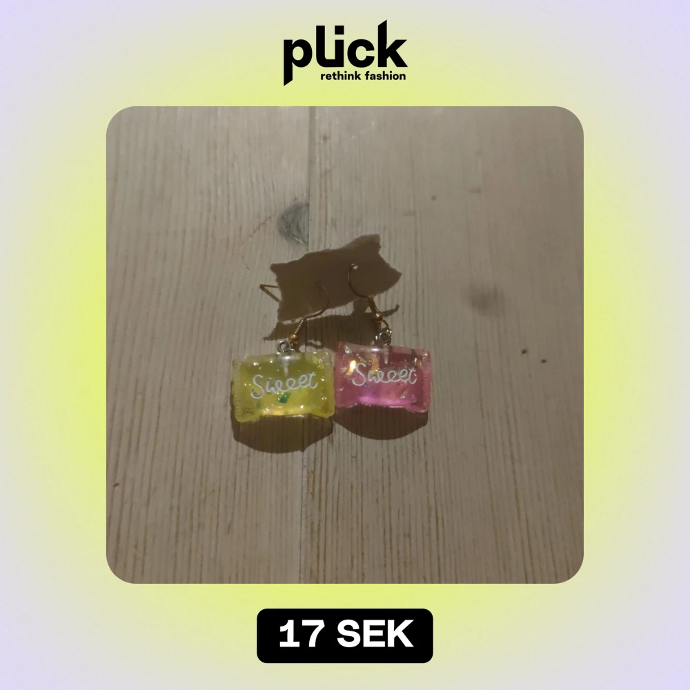 Säljer ett par unika och färgglada örhängen i rosa och gul med texten 'Sweet' på framsidan. De är rektangulära och har en glittrig finish som ger en lekfull touch. Perfekta för att liva upp vilken outfit som helst! 🧡