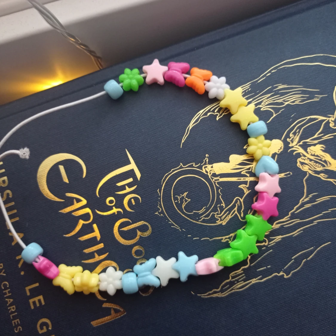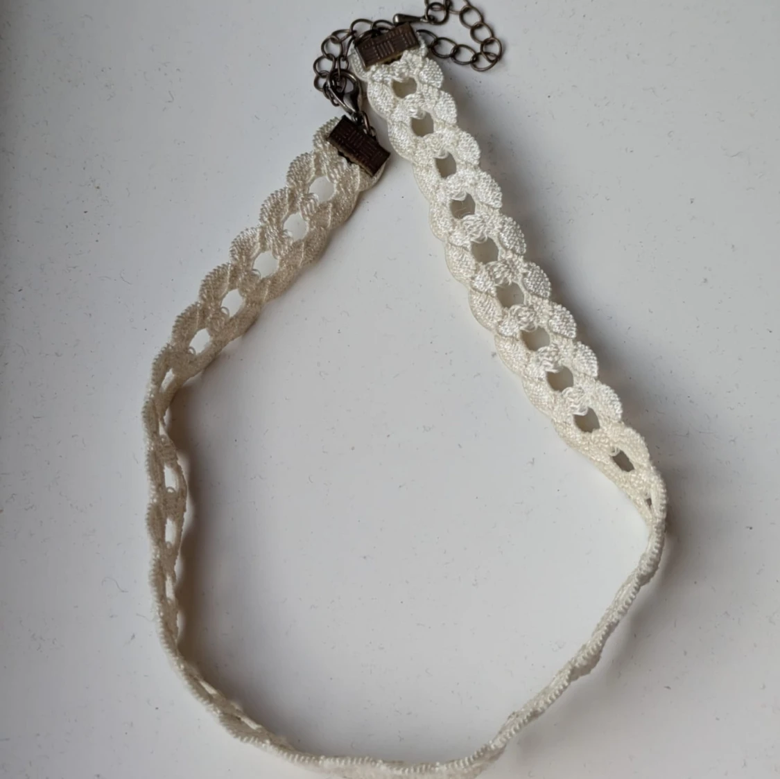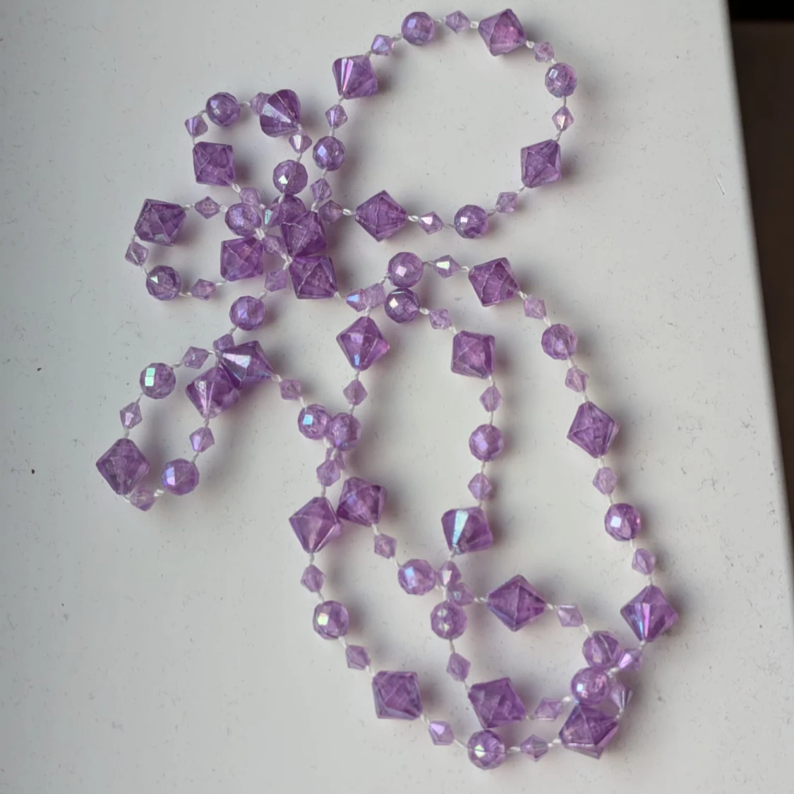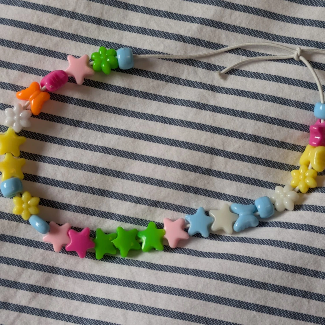 Säljer 3 halsband med två färgglada pärlhalsband och en vit spetschoker. Halsbanden har pärlor i olika former och färger som lila, rosa, grönt och gult. Chokern är i vit spets med justerbart spänne. Perfekt för att liva upp vilken outfit som helst! Alla för 25