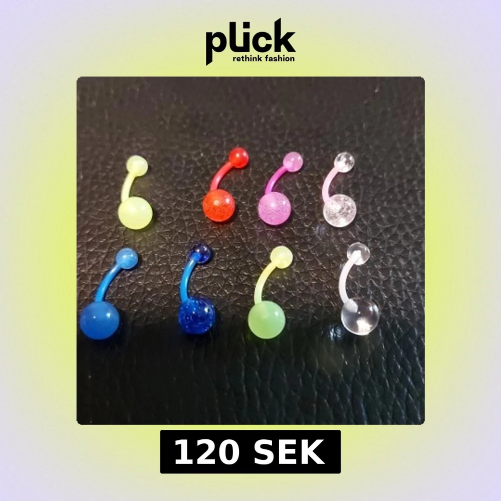 Säljer åtta olika piercing-smycken i plast, perfekta för navelpiercing. Färgerna är neon och klara: gul, röd, rosa, transparent, blå och grön. Kulorna är runda och vissa har glittereffekt. Snygga att mixa och matcha!