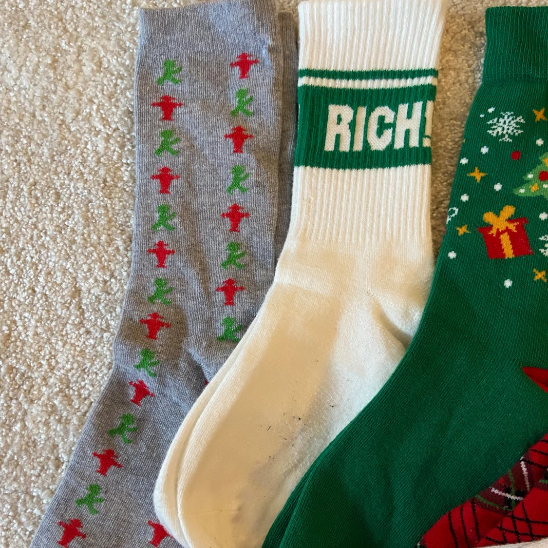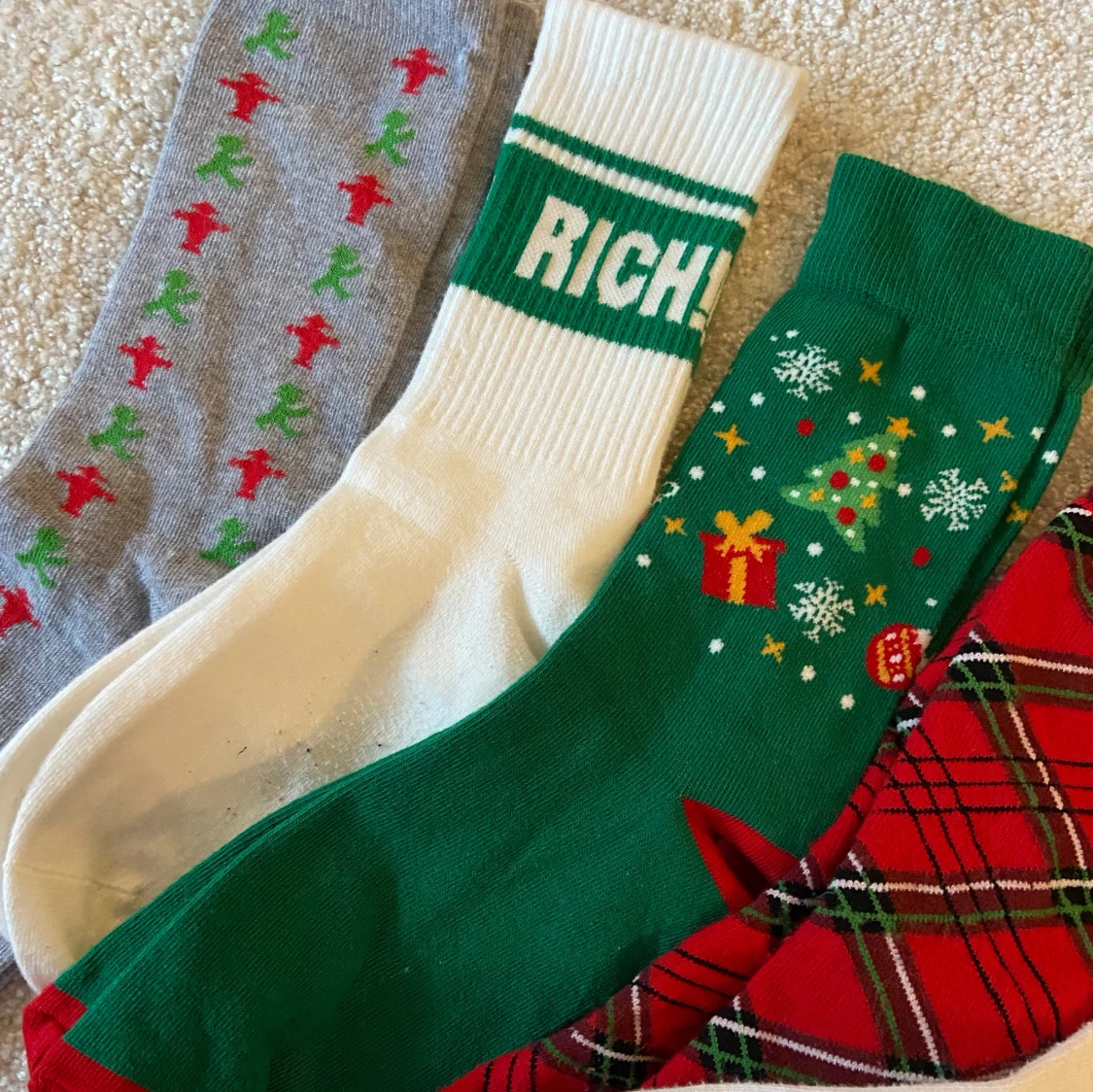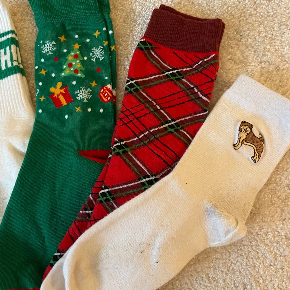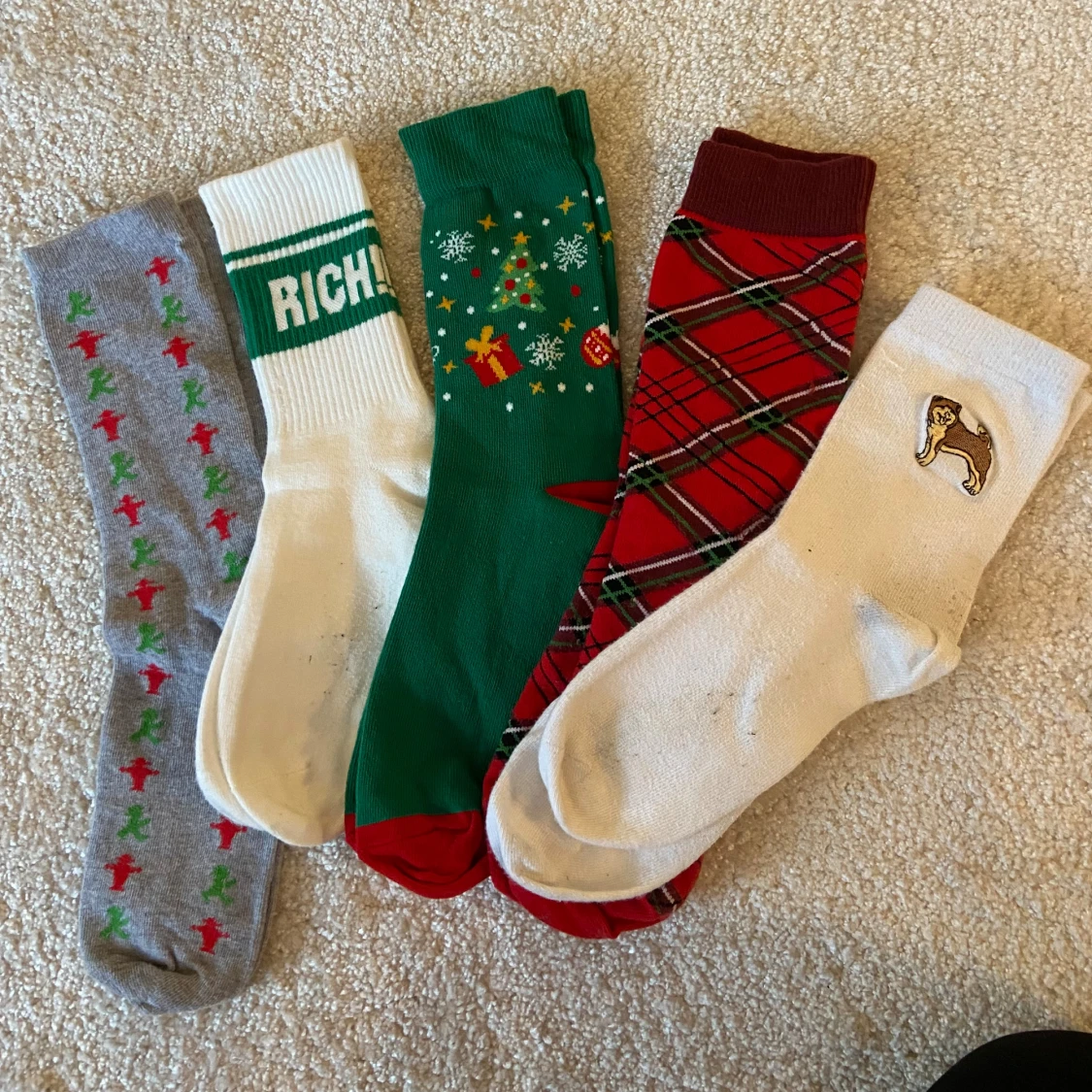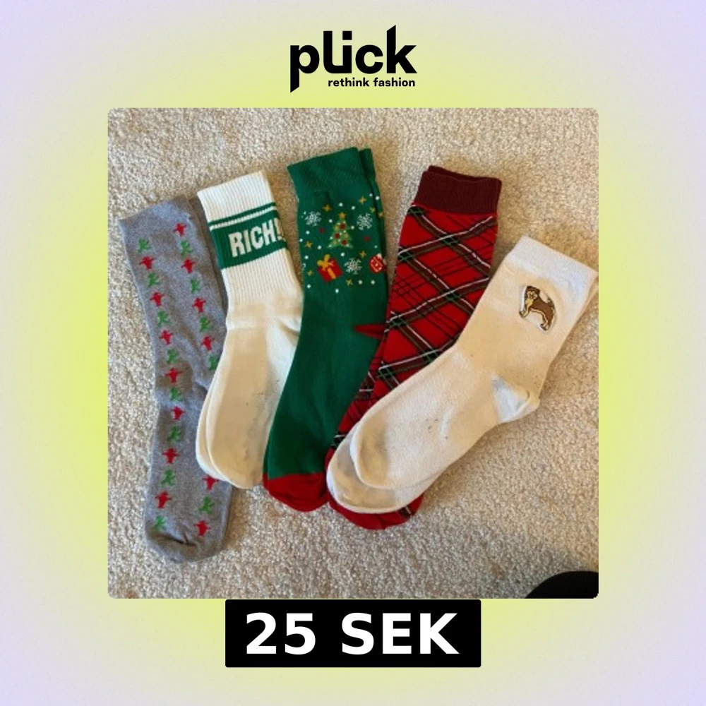 Fem st roliga strumpor i olika färger 🌺🌙Perfekt om man vill skapa unika outfits! ⭐️Storlek är runt 38-40 men funkar såklart på mindre också 💚De gråa och gröna är oanvända och de andra är sparsamt använda, givetvis tvättade och väldigt fräscha! 🩵🩶Kan finnas nån noppa men inget som stör och printet är så fint ändå ❣️