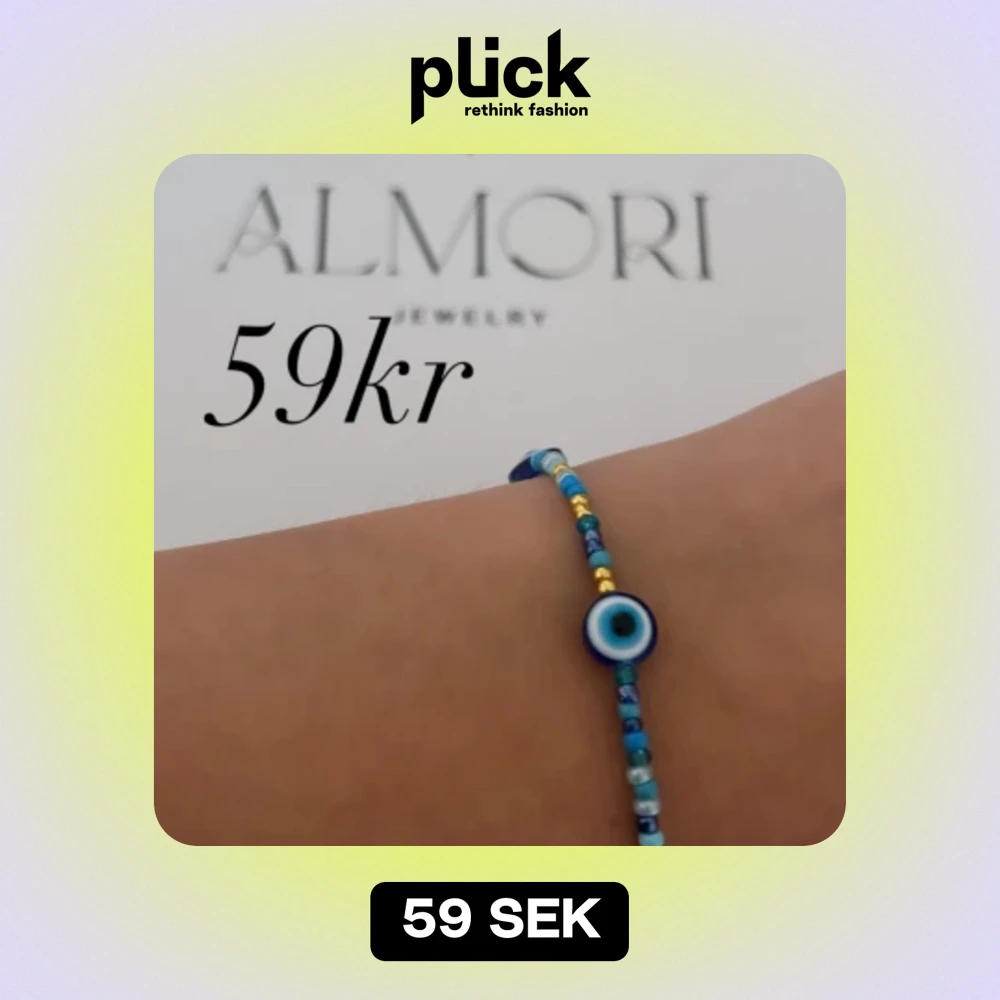 Ett färgglatt armband från Almori med ett dekorativt öga i mitten. Armbandet består av små pärlor i olika färger, inklusive blå, guld och vit.