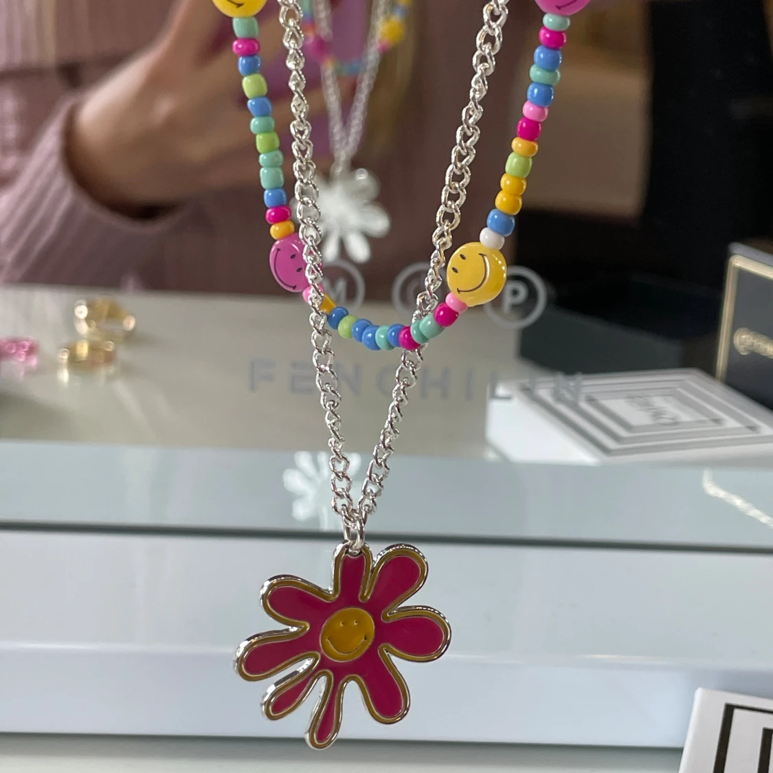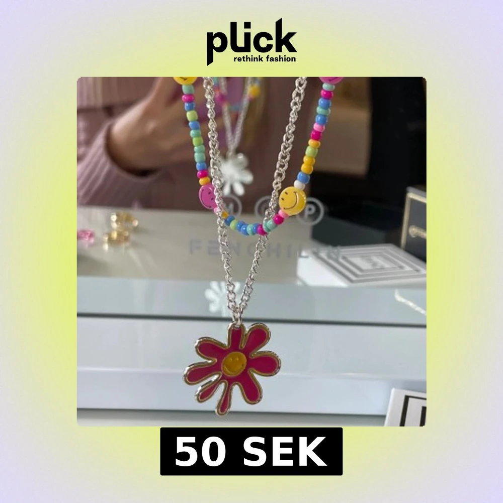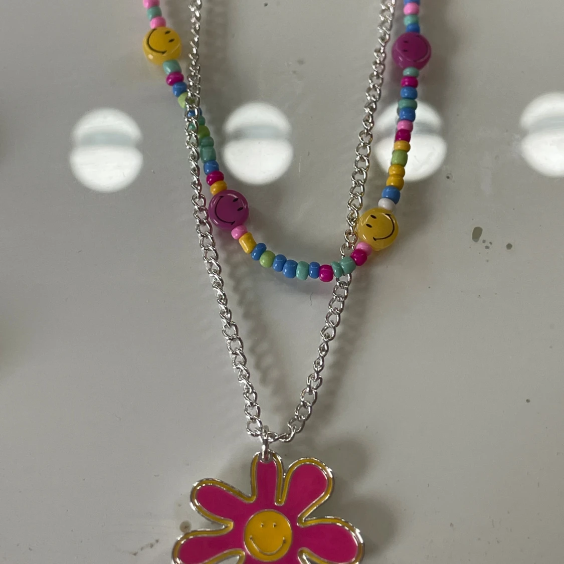 Dubbelhalsband med en silverfärgad kedja och en rad av färgglada pärlor och smiley-ansikten. Stort hänge i form av en rosa blomma med gul mitt. Perfekt för dig som gillar lekfulla accessoarer och färg. Säljer matchande ringar till också😊