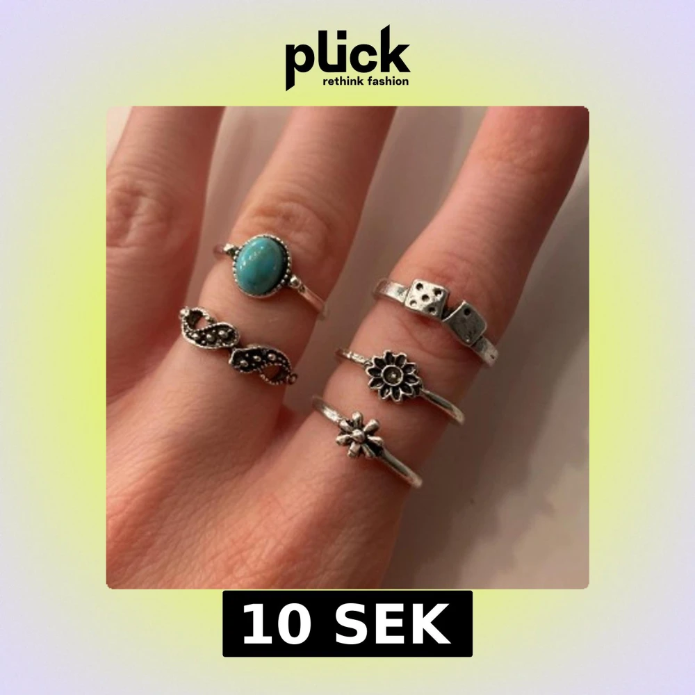 Säljer ett set med fem tunna ringar i silverfärg. Några ringar har detaljer som blommor, tärningar och en oval turkos sten. Alla är helt oanvända och är ej äkta silver eller kristall. Alla för 10kr, 3kr styck! ❤️