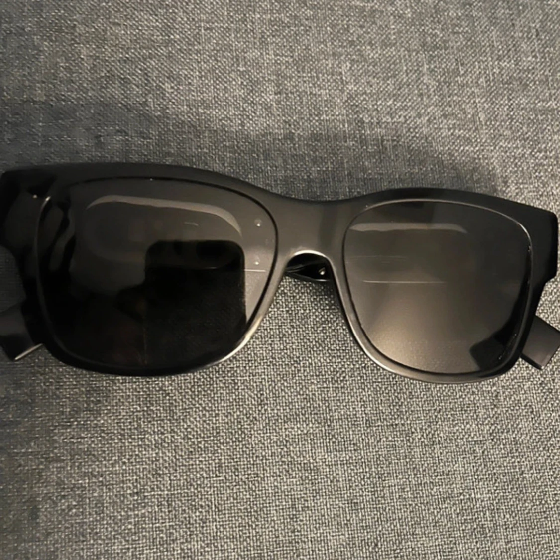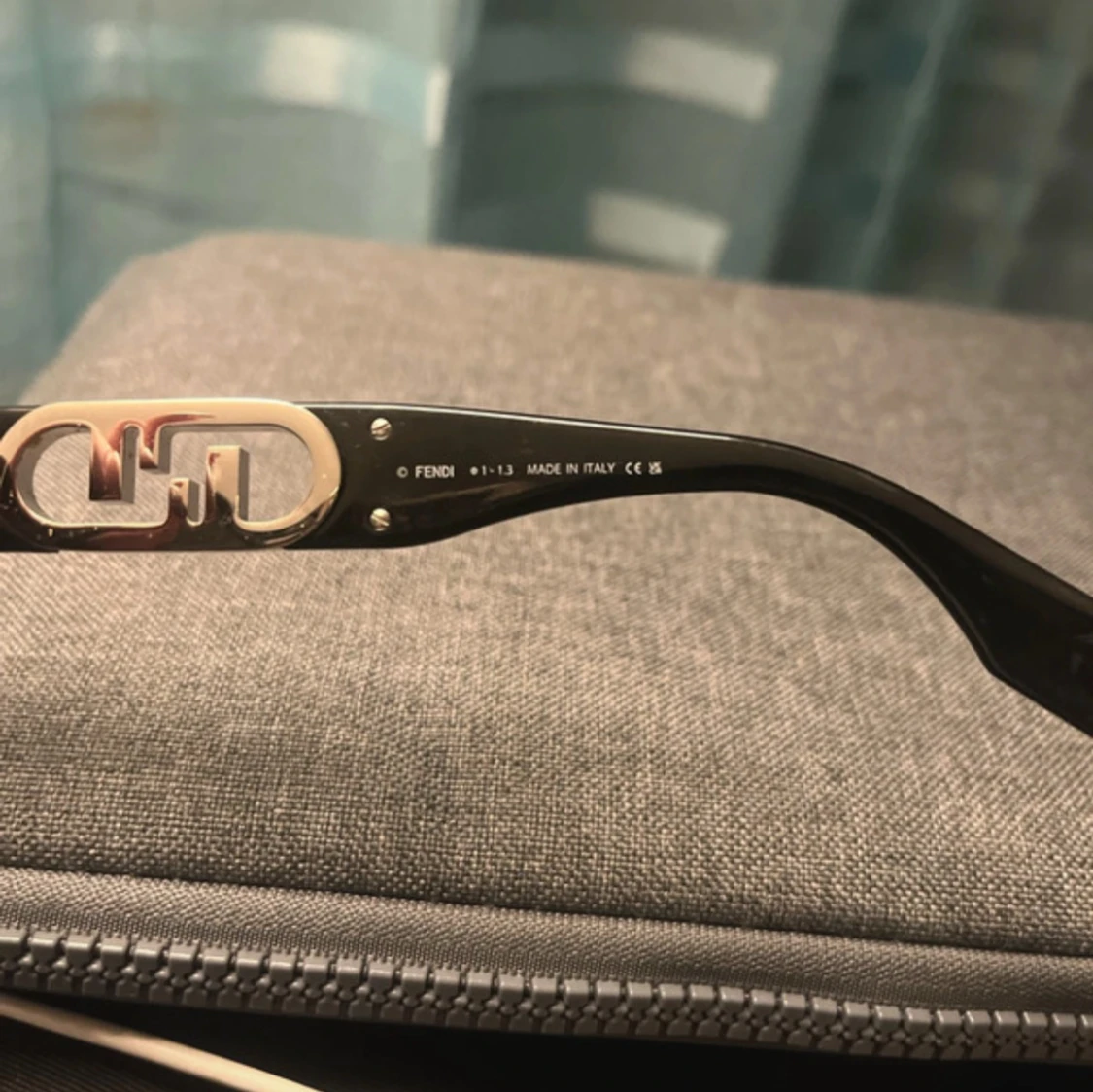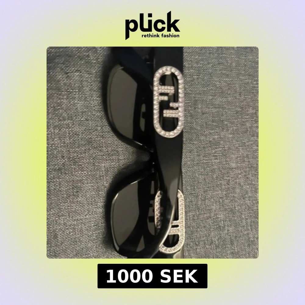 Snygga svarta solglasögon från Fendi med rektangulära bågar och ikoniska Fendi-loggor i silver och strass på sidorna. Glasögonen har en lyxig känsla och passar perfekt för dig som vill sticka ut med en exklusiv accessoar. Pris går att diskutera