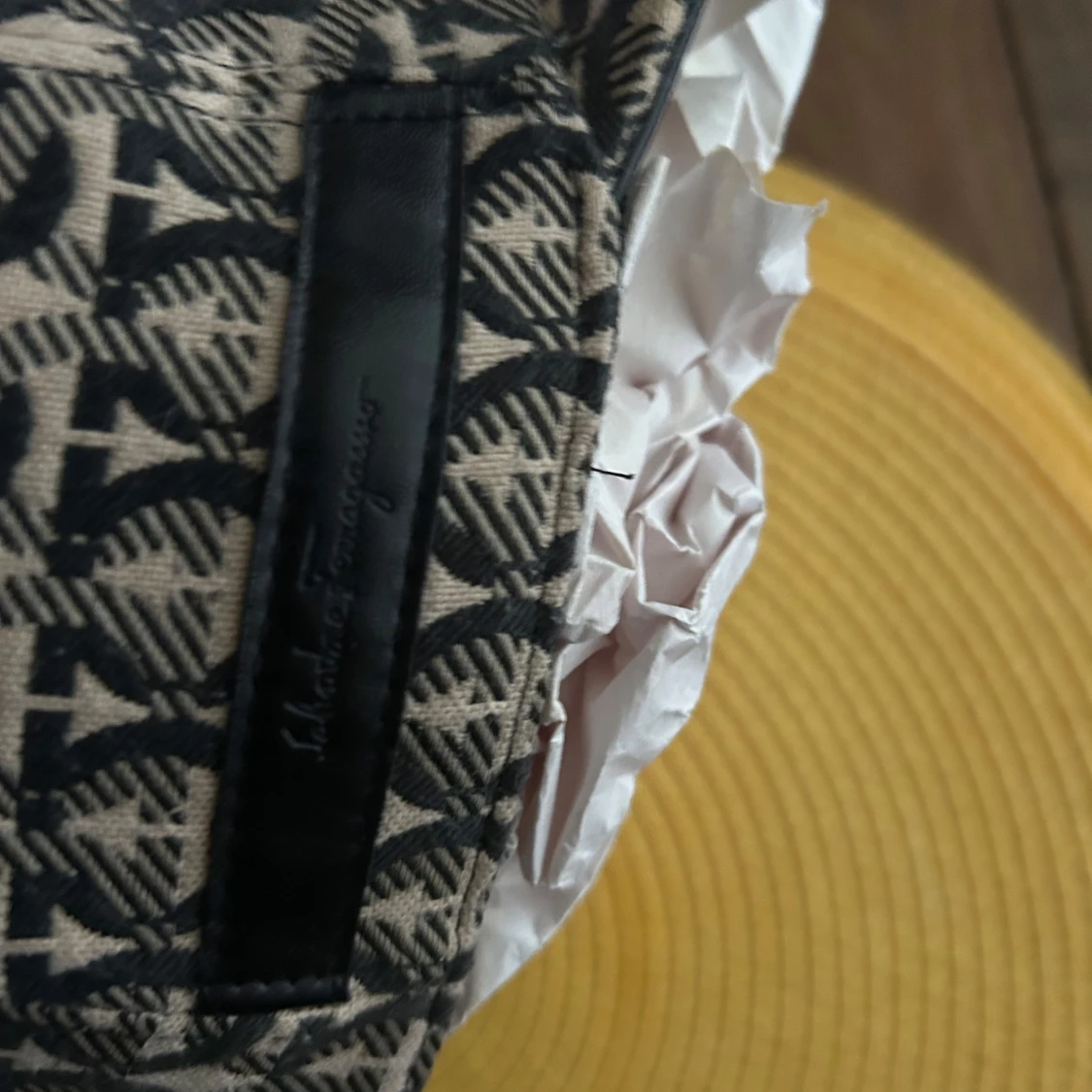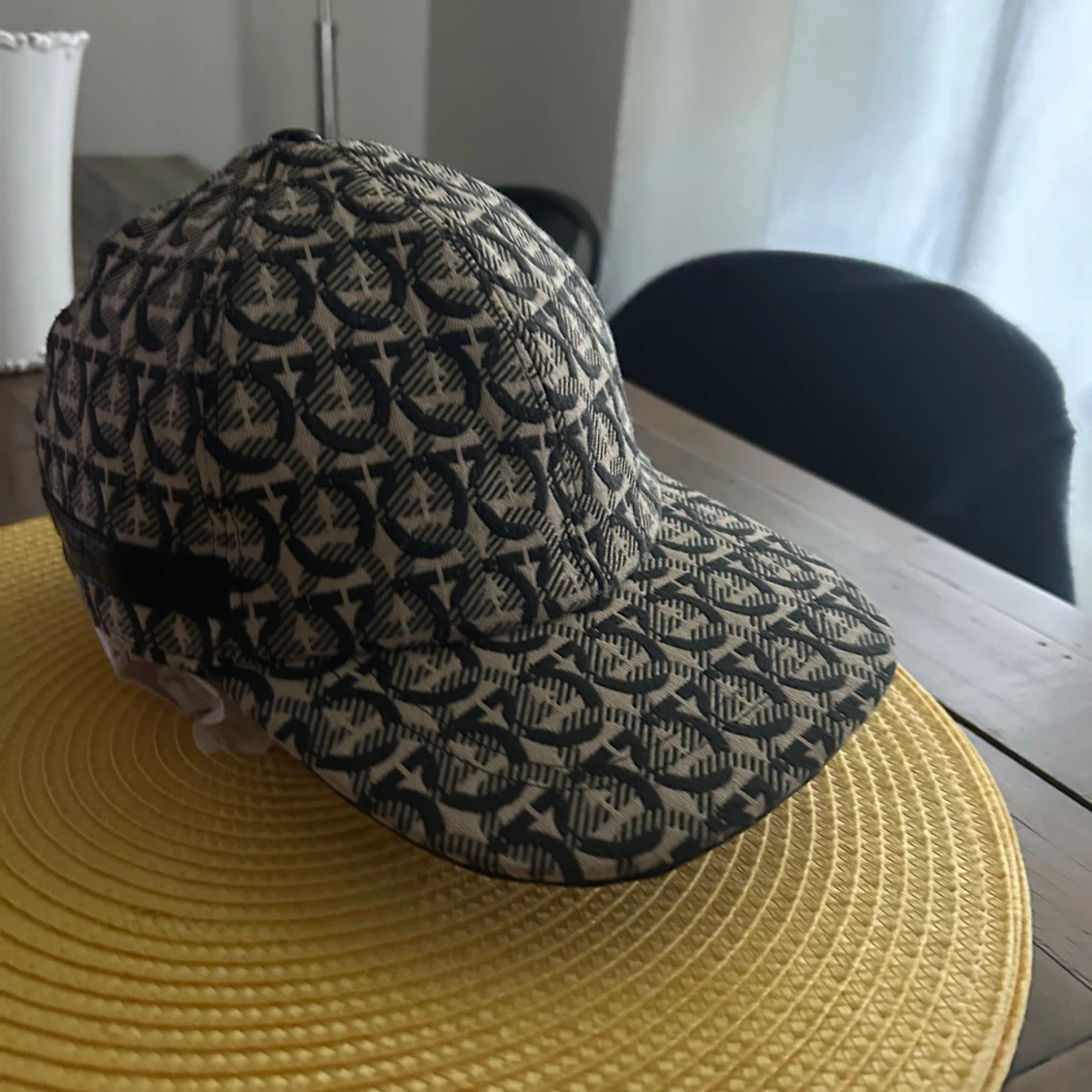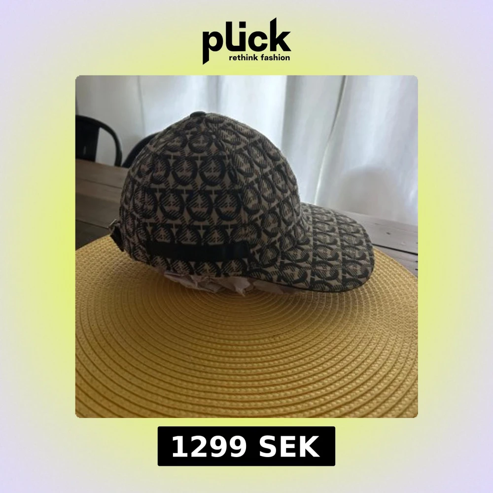Snygg keps från Salvatore Ferragamo med beige och svart mönster över hela kepsen. Klassisk böjd skärm och justerbar rem bak i svart skinn. Ny skick använd 5 gånger