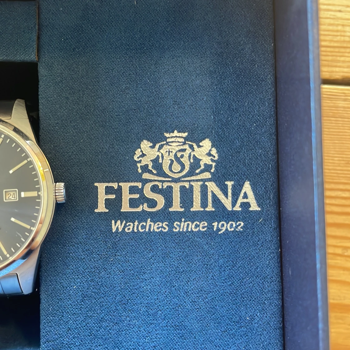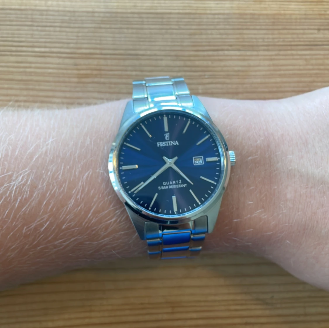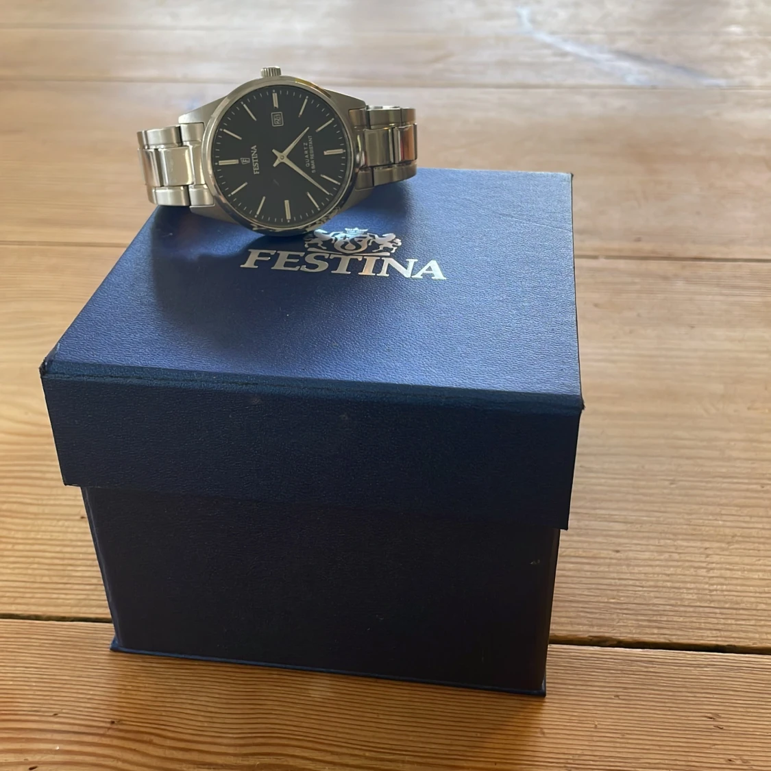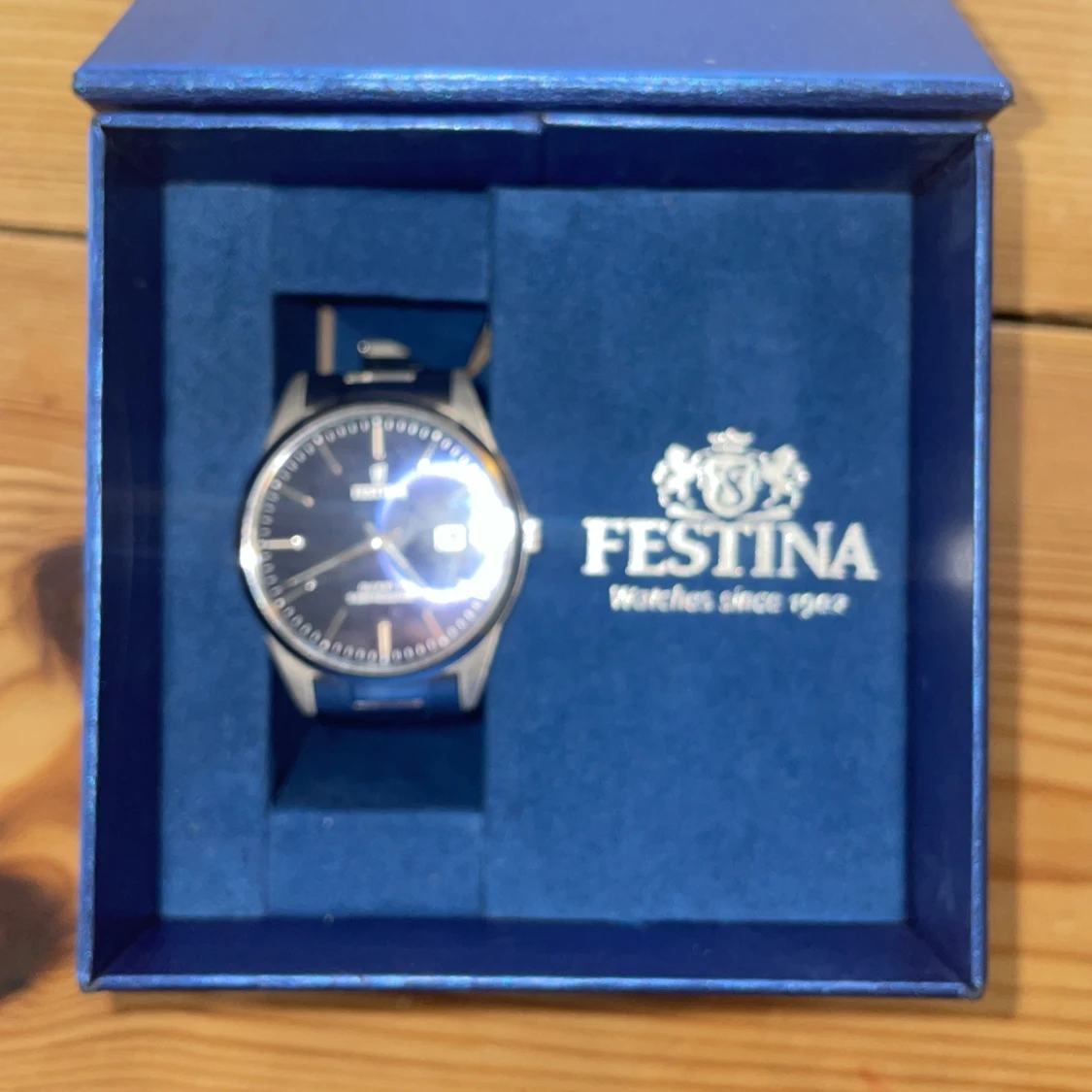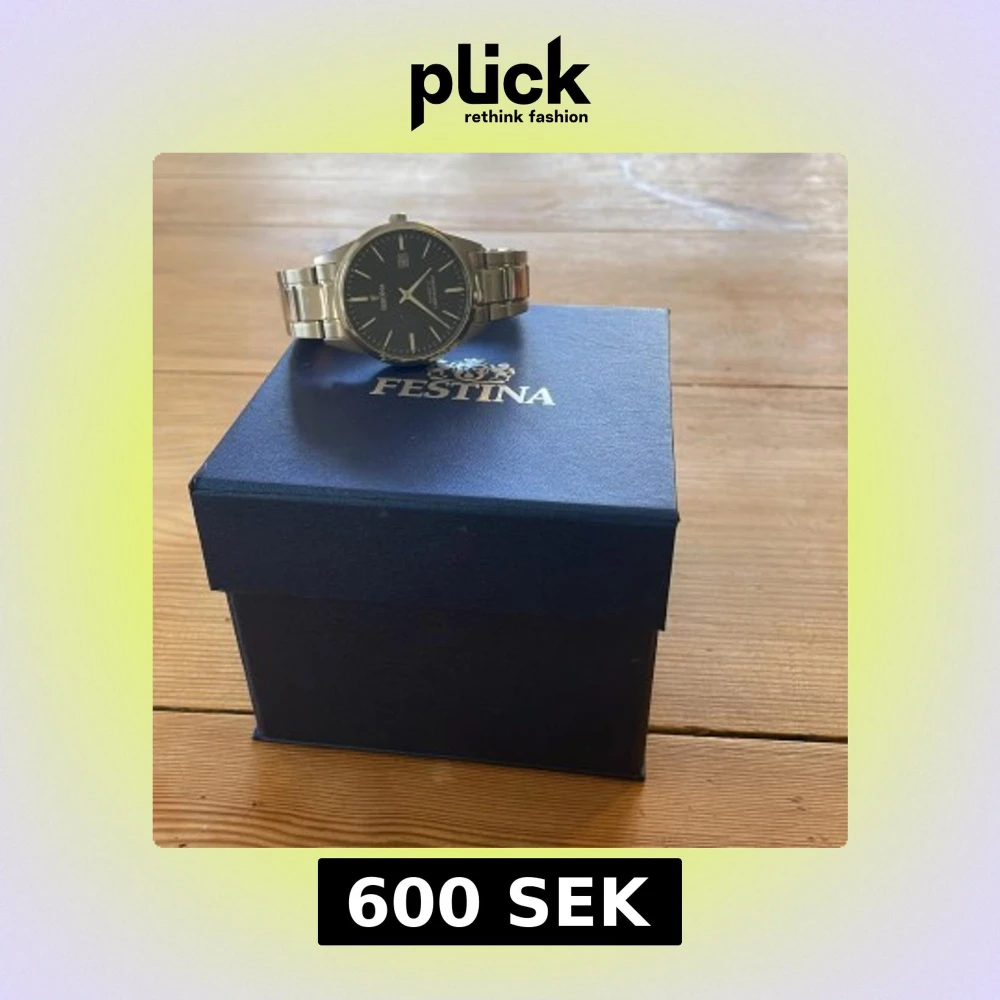 Stilren herrklocka från Festina med blå urtavla och datumvisning. Nytt pris 1500. Klockan har ett klassiskt runt silverfärgat boett och matchande länkarmband i metall. Quartz-urverk och vattentålig upp till 5 bar. Levereras i originalask.