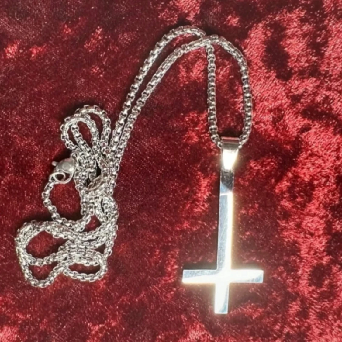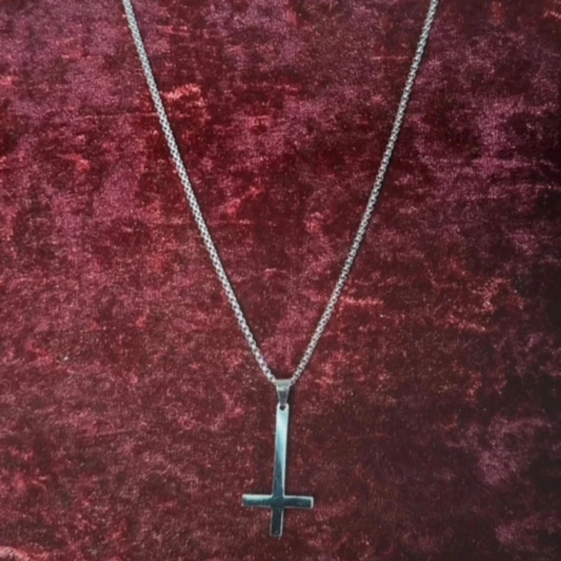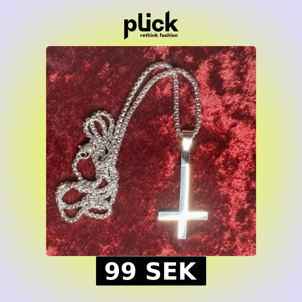 Halsband i rostfritt stål med inverterat kors – perfekt för goth, punk, metal och alternativ stil. Korset är ca 5 × 2,5 cm och kedjan ca 58 cm lång. Tåligt, blankt och håller sin finish över tid. Passar både till vardags och scen. Prutning accepteras inte, men jag erbjuder gärna rabatt vid köp av flera saker. Jag rensar smyckesskrin och garderob – kolla mina andra annonser!