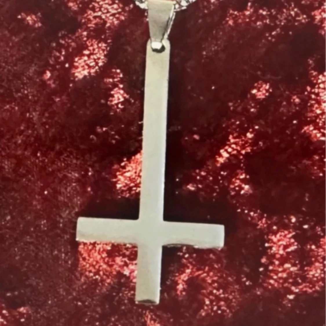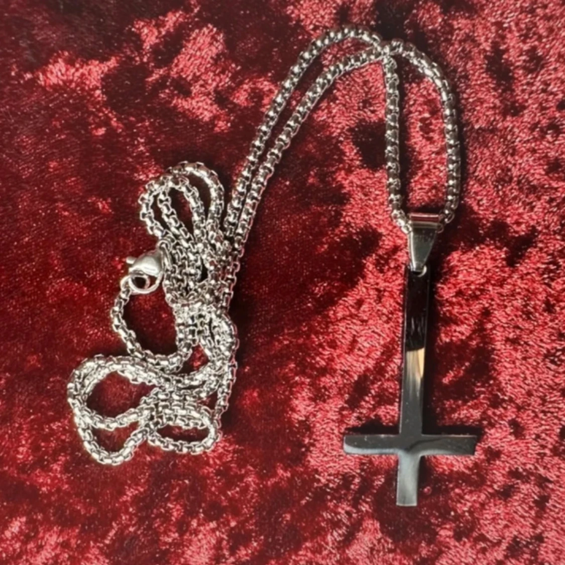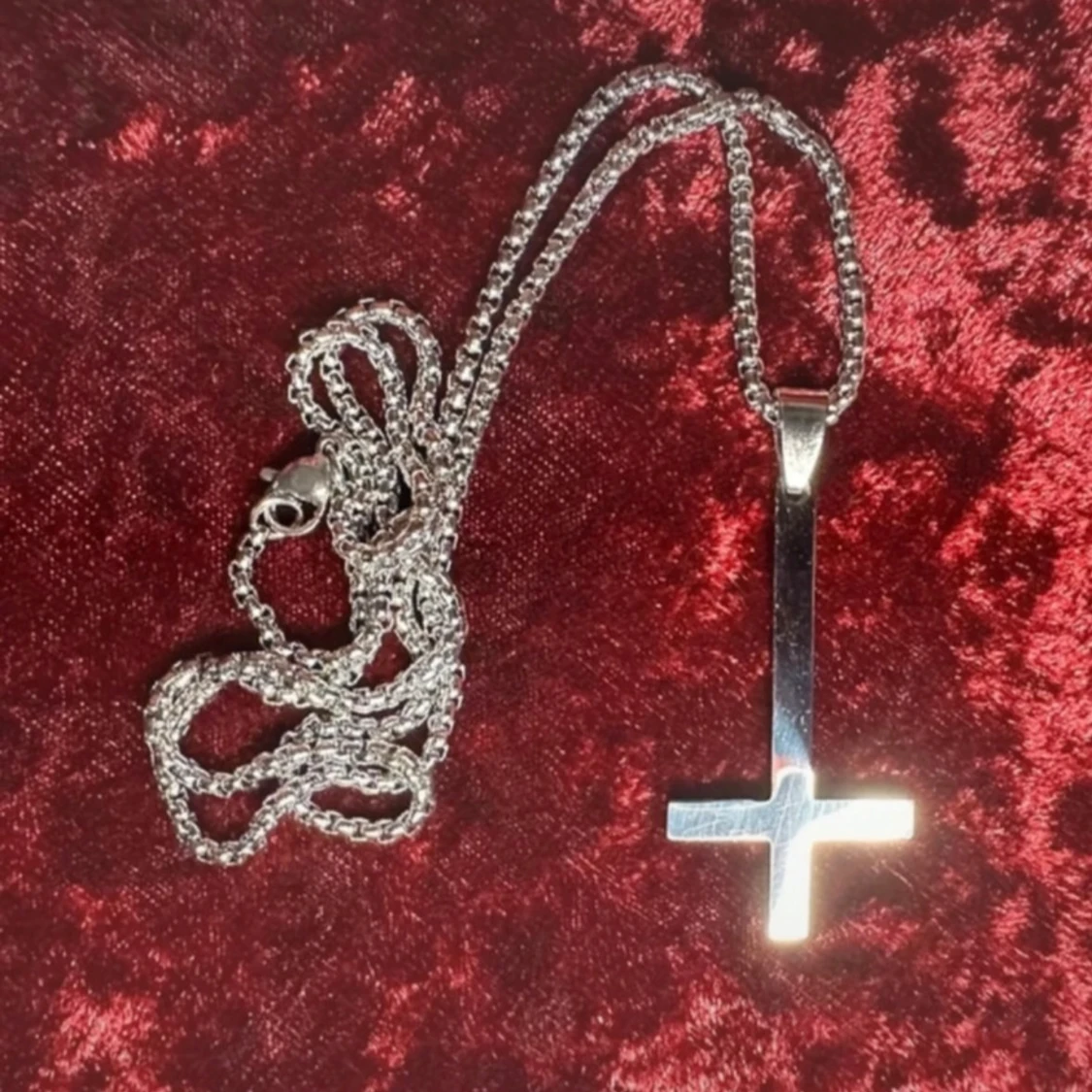 Halsband i rostfritt stål med inverterat kors – perfekt för goth, punk, metal och alternativ stil. Korset är ca 5 × 2,5 cm och kedjan ca 58 cm lång. Tåligt, blankt och håller sin finish över tid. Passar både till vardags och scen. Prutning accepteras inte, men jag erbjuder gärna rabatt vid köp av flera saker. Jag rensar smyckesskrin och garderob – kolla mina andra annonser!
