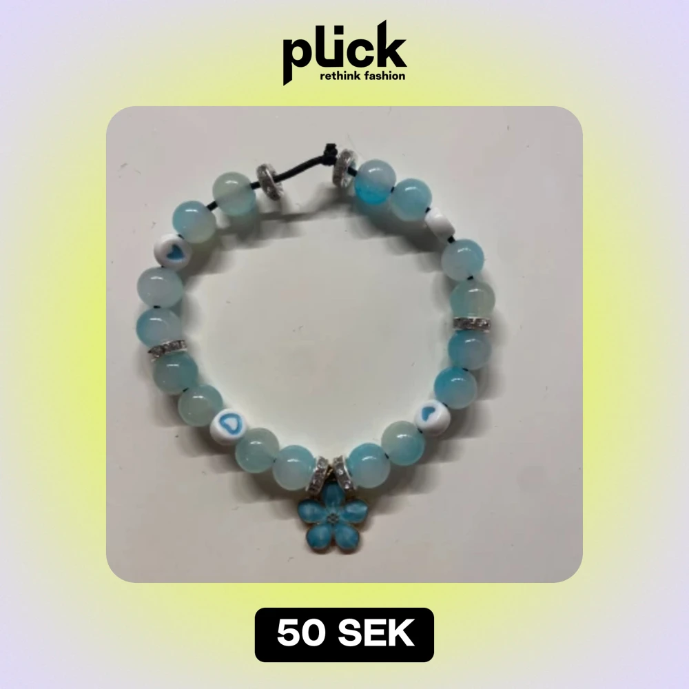 Säljer ett superfint armband med blå och vita pärlor. Armbandet har små hjärtan på några av pärlorna och en söt blomma som hänge. Det är elastiskt och passar de flesta handleder. Perfekt för att ge en färgklick till din outfit! Helt handgjort av mig