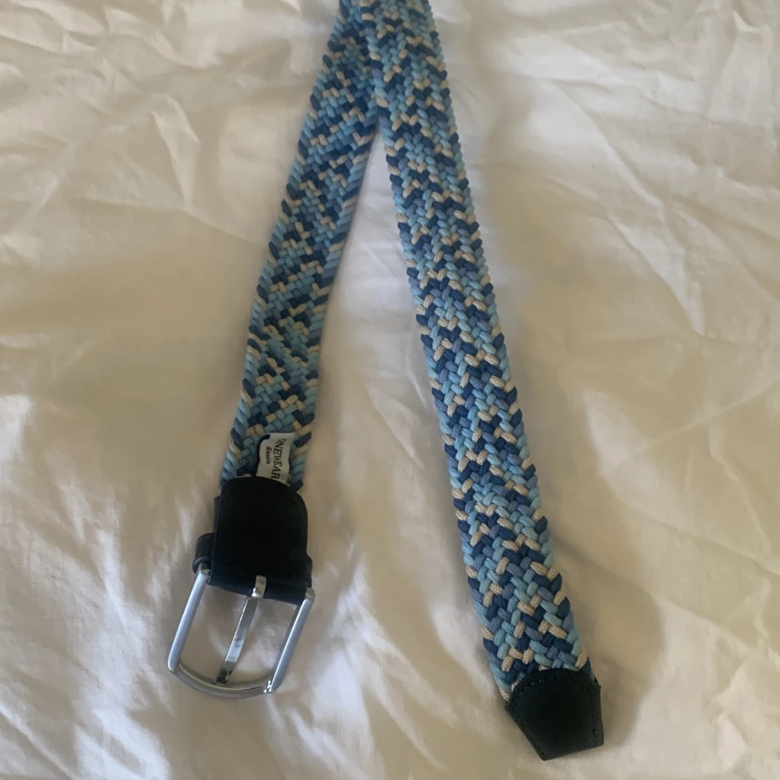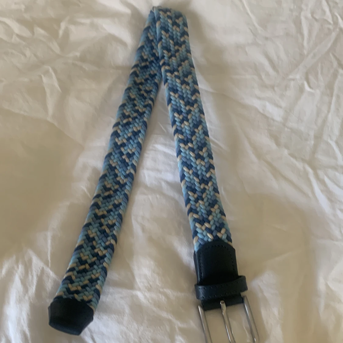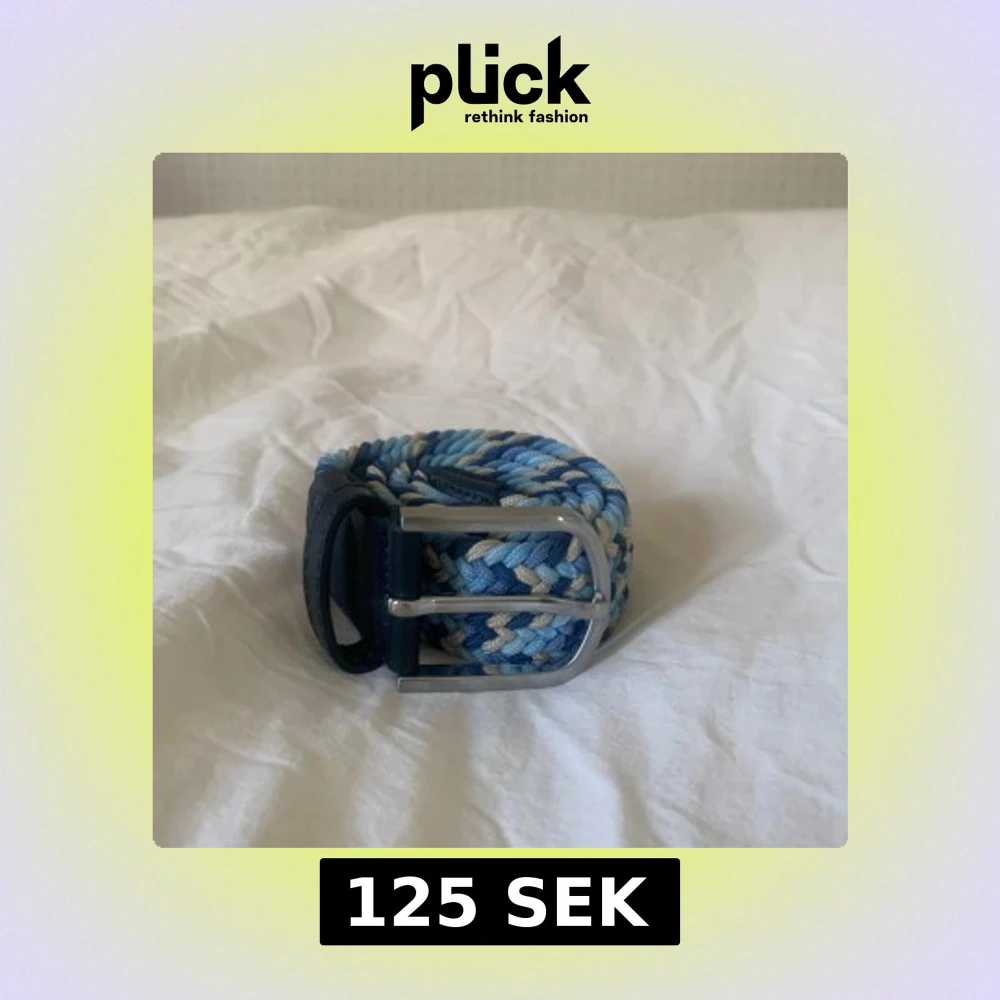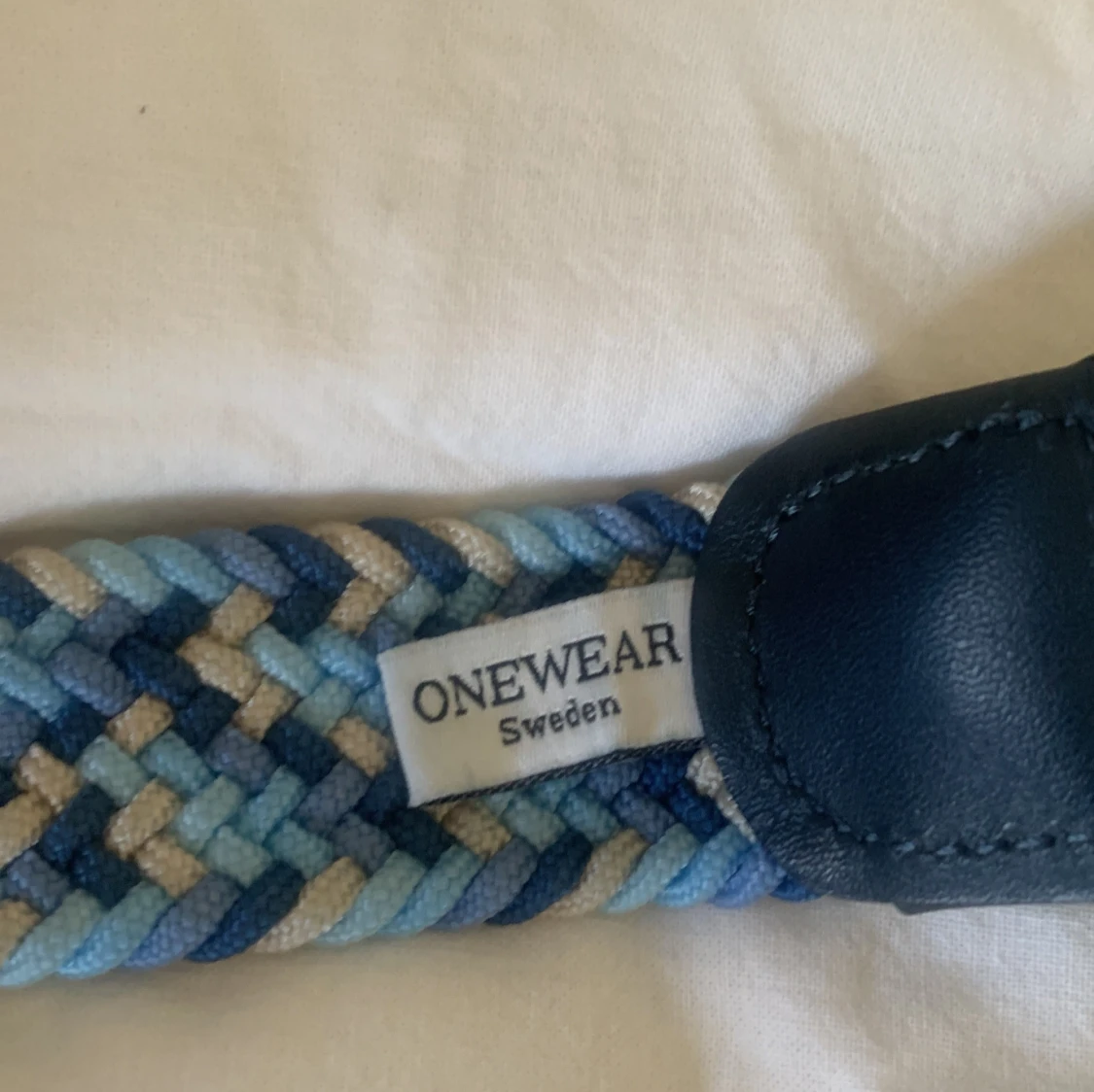 Snyggt flätat bälte från ONEWear Sweden i olika blå nyanser, beige och vitt. Bältet har detaljer i mörkblått skinn och ett silvrigt spänne. Perfekt accessoar för att lyfta din outfit med lite färg och stil.
