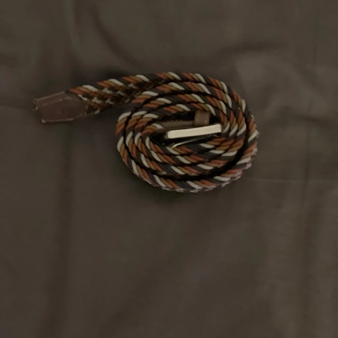 Snyggt flätat bälte med ett mönster i brunt, beige, vitt och svart. Bältet har en klassisk metallspänne och är perfekt för att ge en färgklick till din outfit. Passar både till jeans och chinos. 95cm