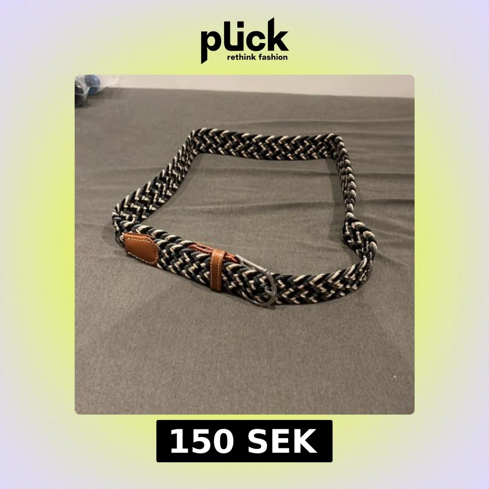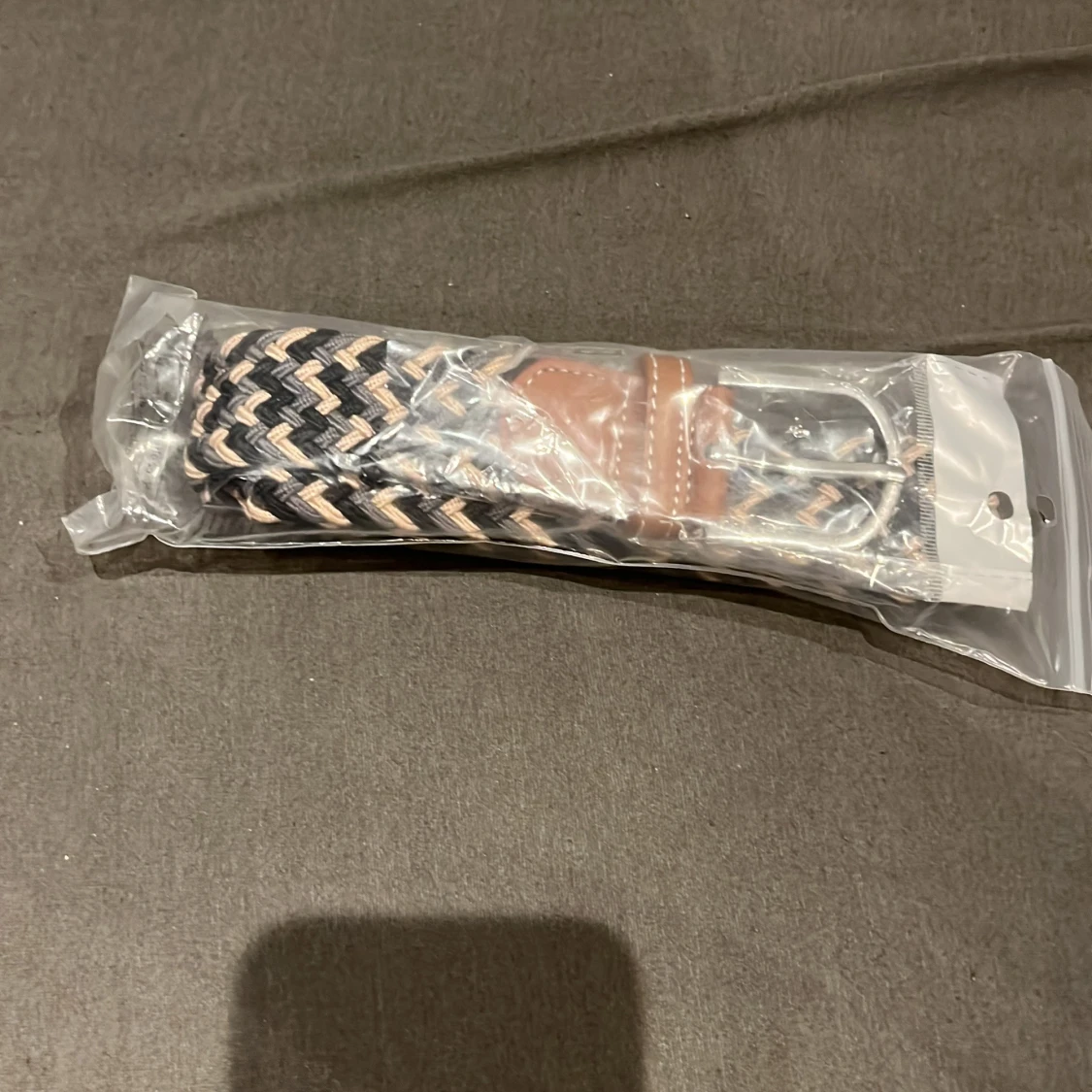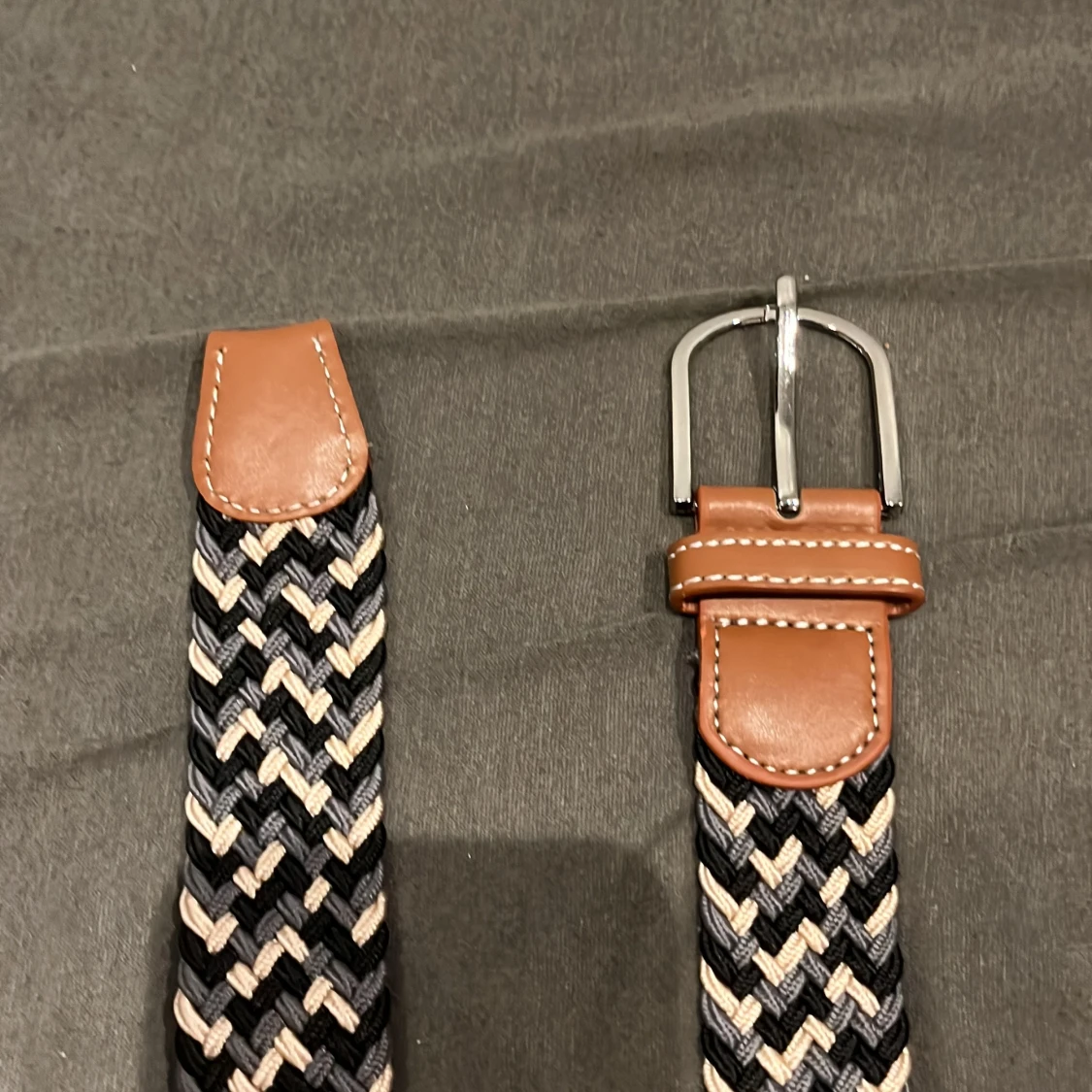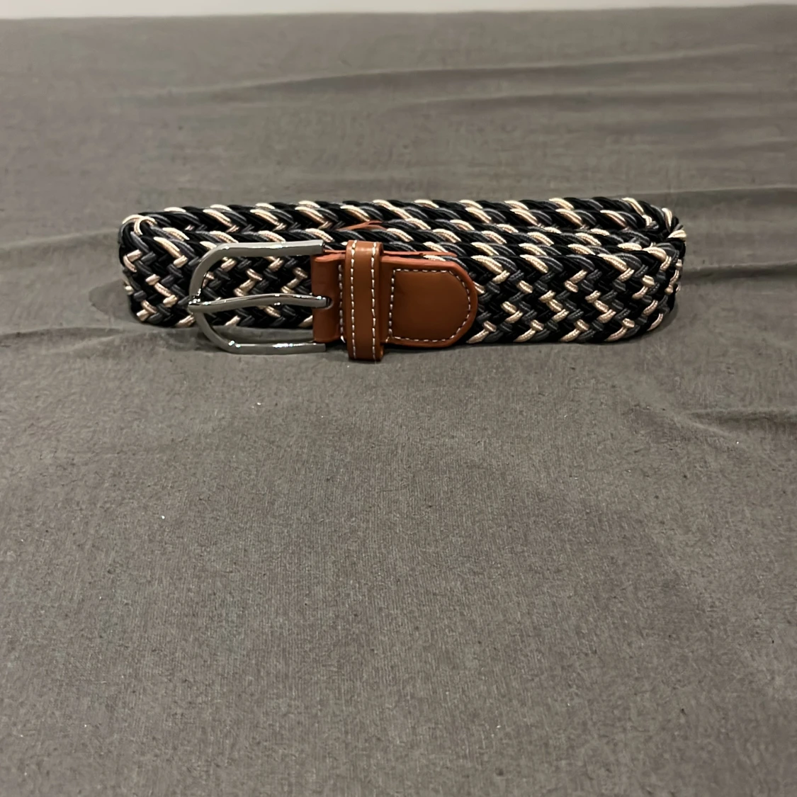 Snyggt flätat bälte i svart, beige och grått med detaljer i brunt skinn och silverspänne. Bältet har ett coolt mönster och passar perfekt till jeans eller chinos. Flexibel och justerbar längd tack vare det elastiska materialet. Helt ny och oanvänd.