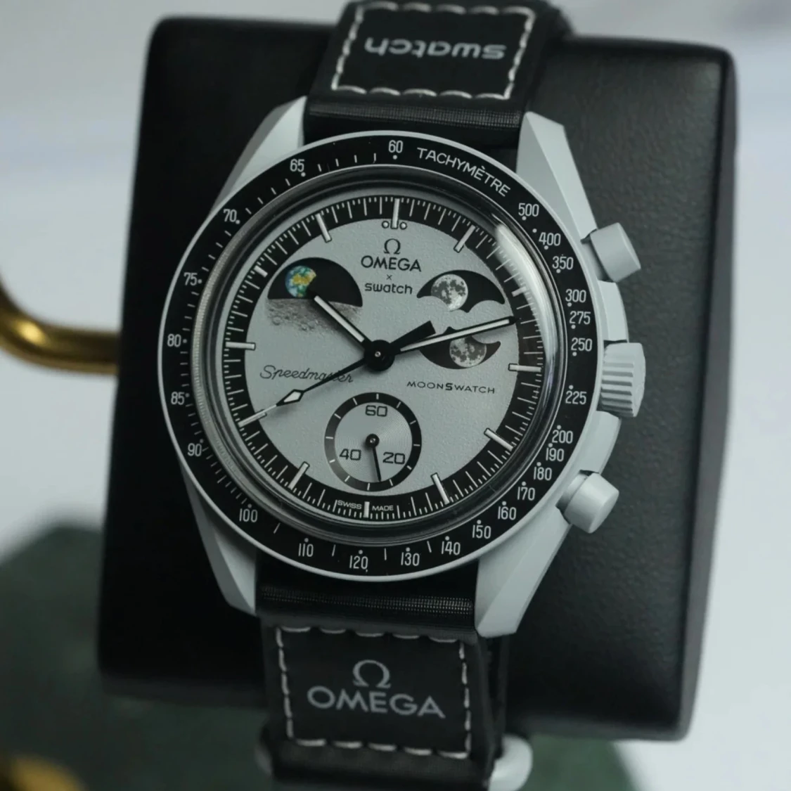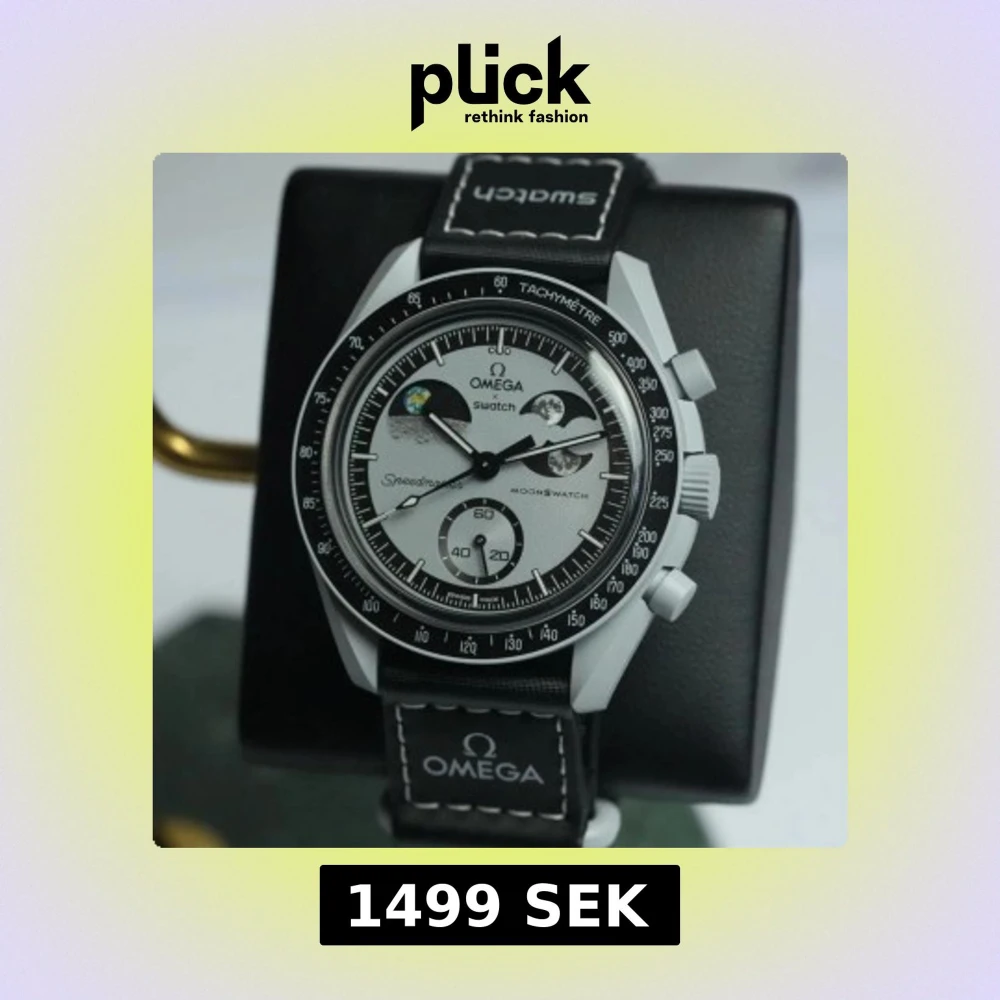 Omega x Swatch MoonSwatch Speedmaster med svart och silver urtavla, tachymeter och lysande visare. Klockan har svart textilband med vit söm och Omega-logga. Snygg och futuristisk design med månmotiv på urtavlan. Perfekt för dig som gillar rymdtema och coola detaljer. Jag har beställt det, och leveransen kommer att vara sen
