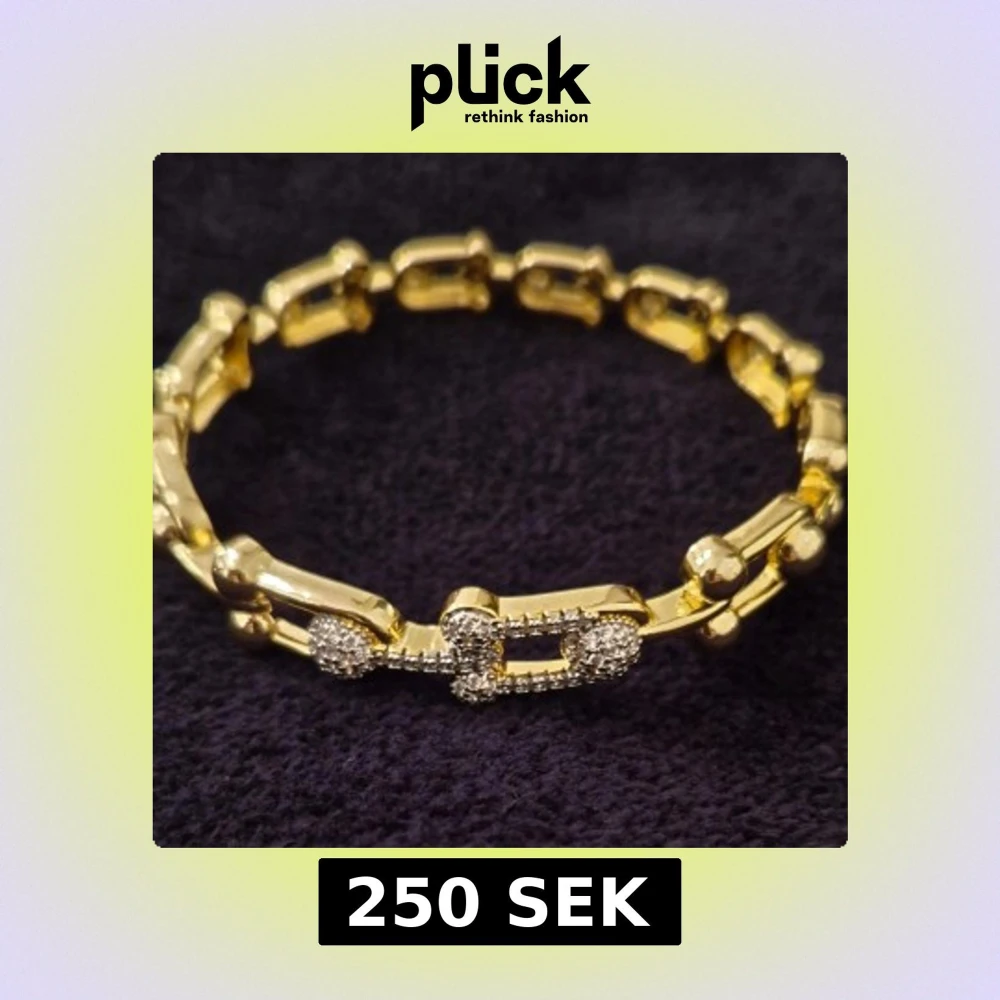 Unikt armband i guldton med länkar som har rundade och rektangulära hästskoformer. Vissa länkar är dekorerade med små zirconia stenar insatta med klor i pavé- teknik som ger extra bling. Armbandet är öppningsbart och ser ut som mycket dyrare än bijouteri p.g. a perfekt utförande och steninsättning.Designen är modern och sticker ut med sina geometriska former och skimrande detaljer. Perfekt för dig som gillar att synas.