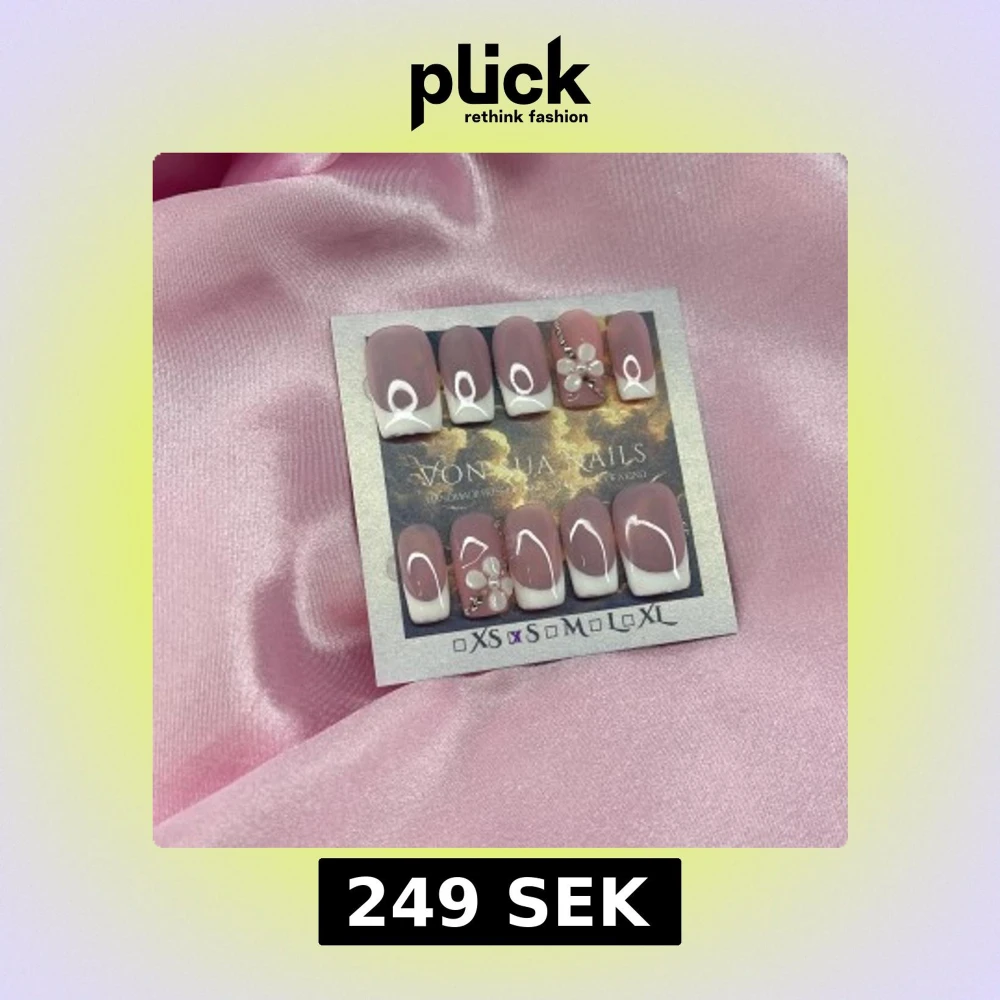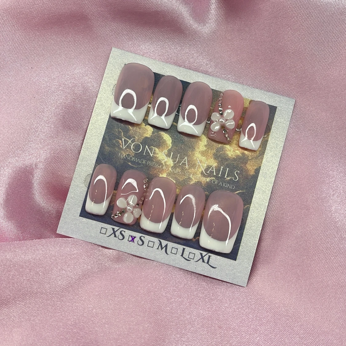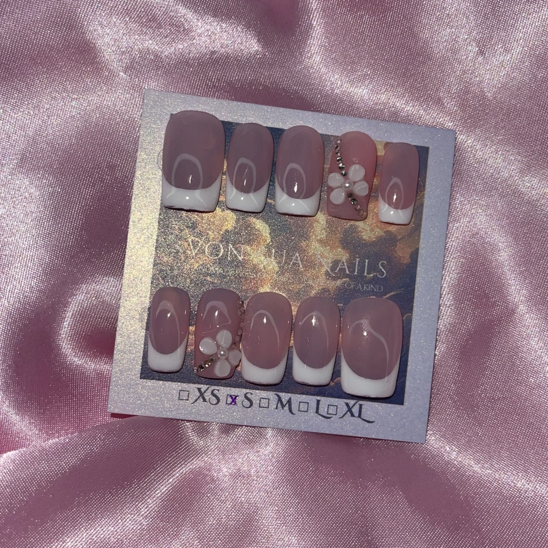 Handgjorda press on-naglar i nude med handmålad vit fransk tipp, dekorerade med vita 3D-blommor och små silverpärlor. Snygg, stilren form och passar dig som vill ha en trendig look. Kommer i S: 15 mm, 11,5 mm, 12 mm, 11 mm, 9 mm ,och är enkla att applicera.