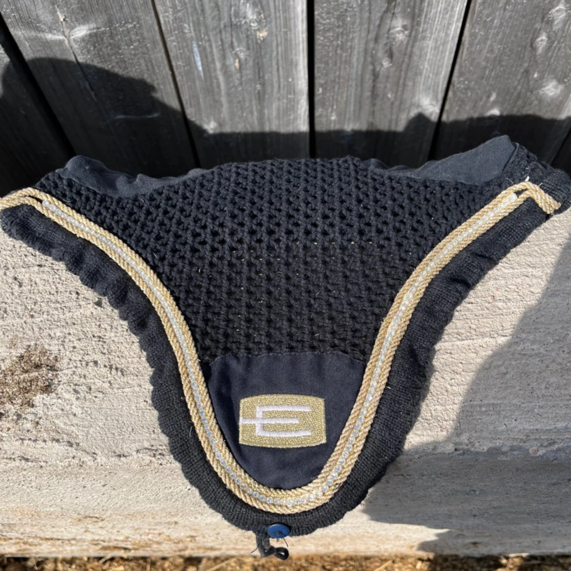 Snygg marinblå huva från Equiline med guldglittrande kant och broderad logga framtill. Huvan är virkad upptill och har släta tygpartier vid öronen. Perfekt för ridning och tävling när du vill sticka ut lite extra.