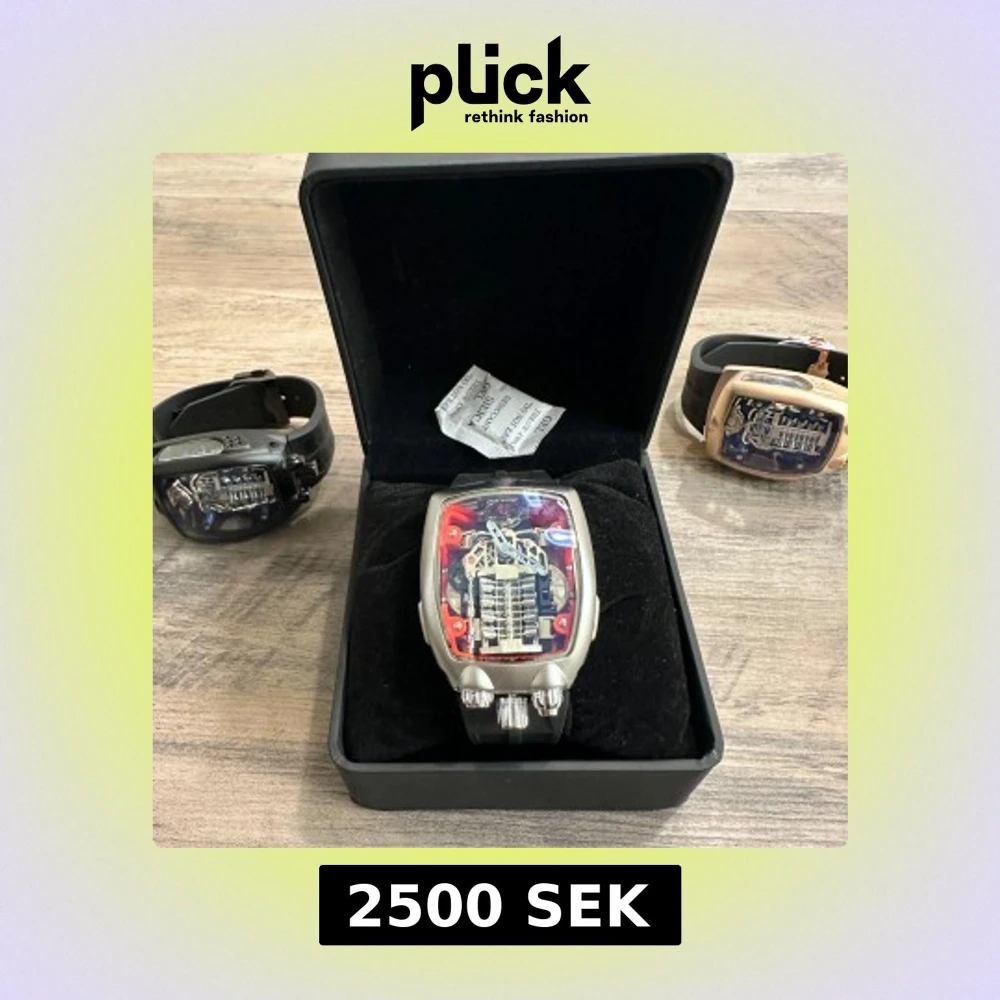 Säljer en riktigt cool klocka med rektangulärt hölje och transparent urtavla som visar den avancerade mekaniken. Klockan har svarta och silverfärgade detaljer, samt ett svart armband. Perfekt för dig som gillar unika accessoarer med modern vibe.