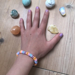 Jag har gjort ett armband med rosa,blåa,gul/orange och lila plattpärlor som jag gjort själv det är också rosa pärlor. Det är ungefär 4.5cm stort och passar på min handled som är ungefär 4cm bred. Det är vinröd tråd som är stretchig . Frakten är 4kr.🌻🎊🎈🍌🍄🍀