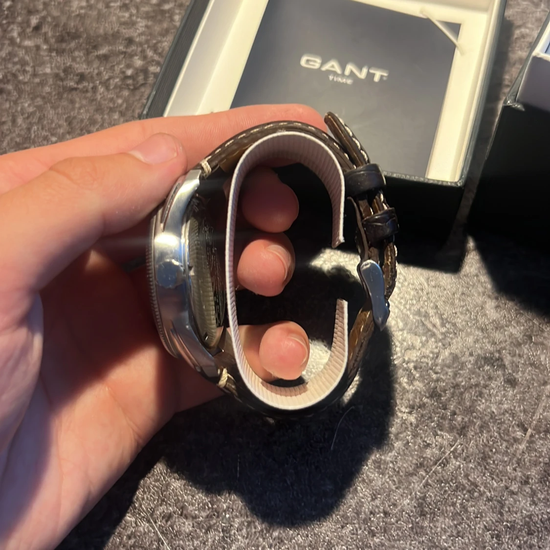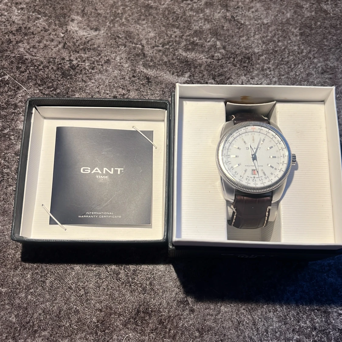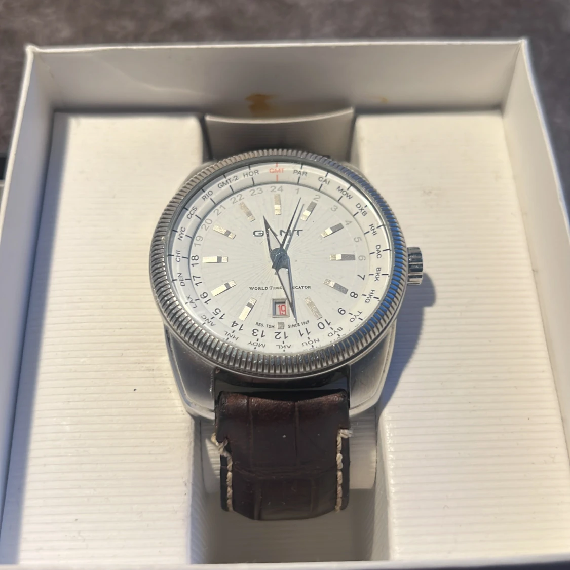 Stilren herrklocka från GANT med vit urtavla och detaljer i silver. Klockan har en rund boett i metall och en mörkbrun läderrem med ljusa sömmar. Urtavlan visar flera tidszoner och har datumvisning. Perfekt accessoar för dig som gillar klassisk och tidlös stil. Batteribyte behövs göras!