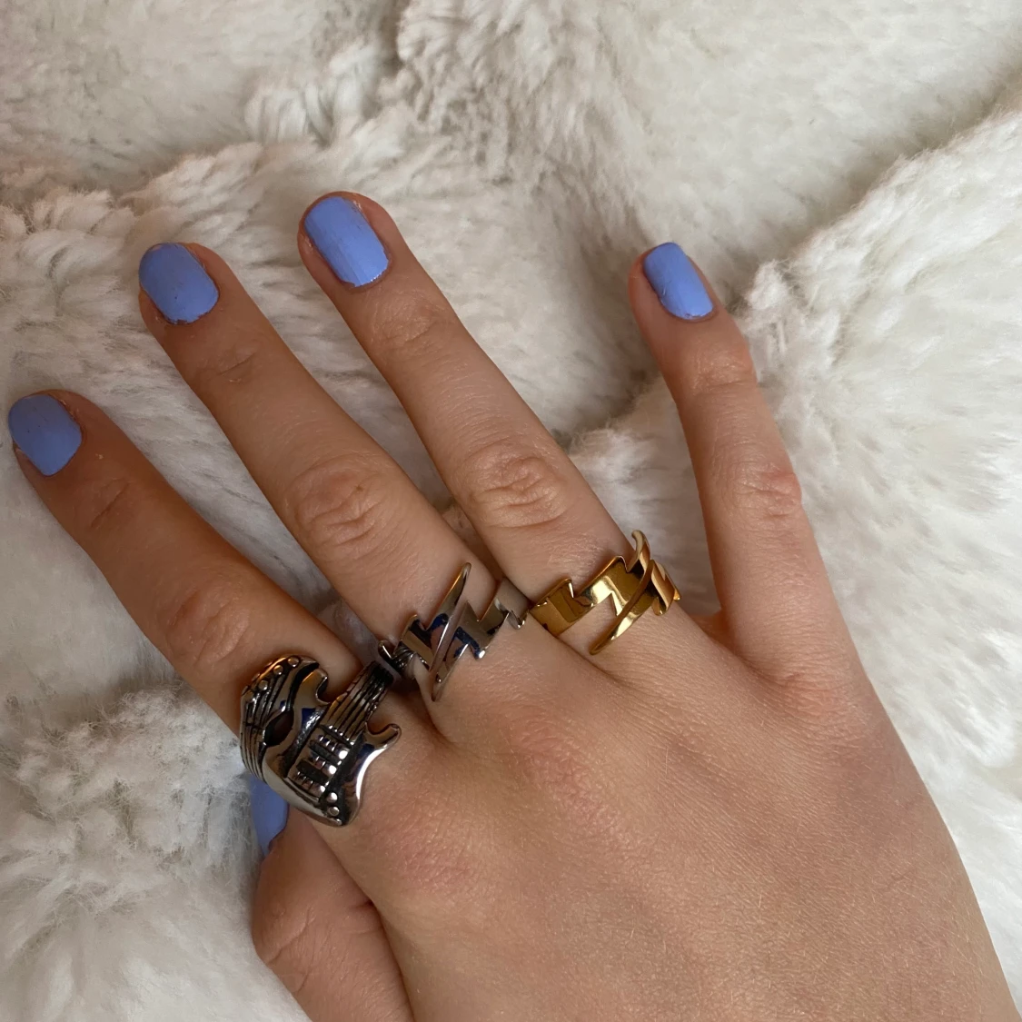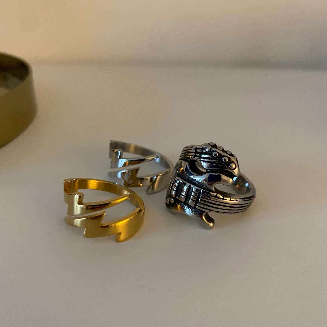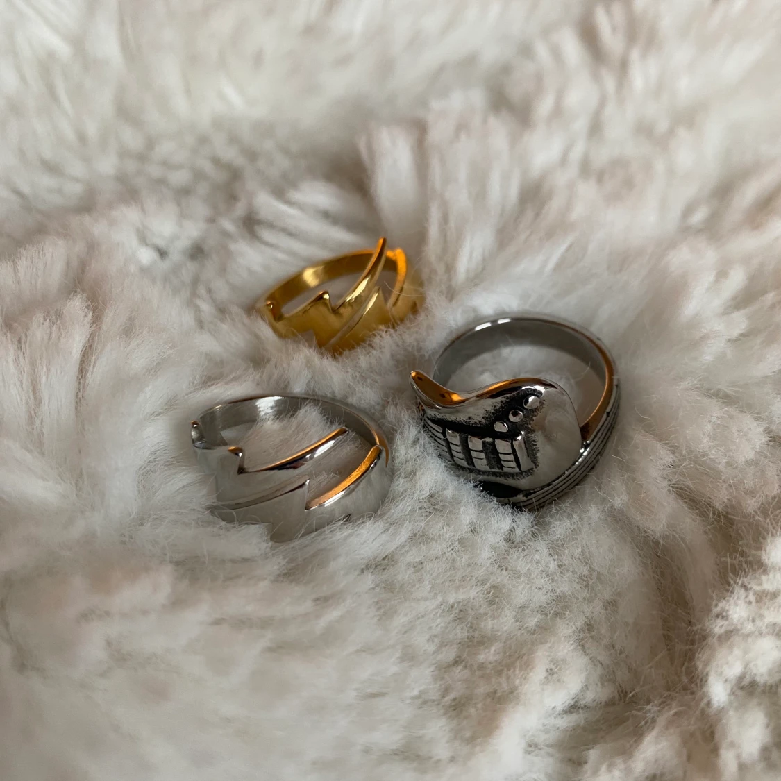 As coola ringar i rostfritt stål ⚡️⚡️köp till dig själv eller som en gåva!💞99 kr för guitar ringen och 89kr för blixt ringen❤️