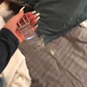 Genomskinligt asballt skärp med ”hål” hela vägen runt. En repa på baksidan (se sista bilden), annars mycket bra skick! Har inte satt något pris så skriv en kommentar vad du kan tänka dig betala💕