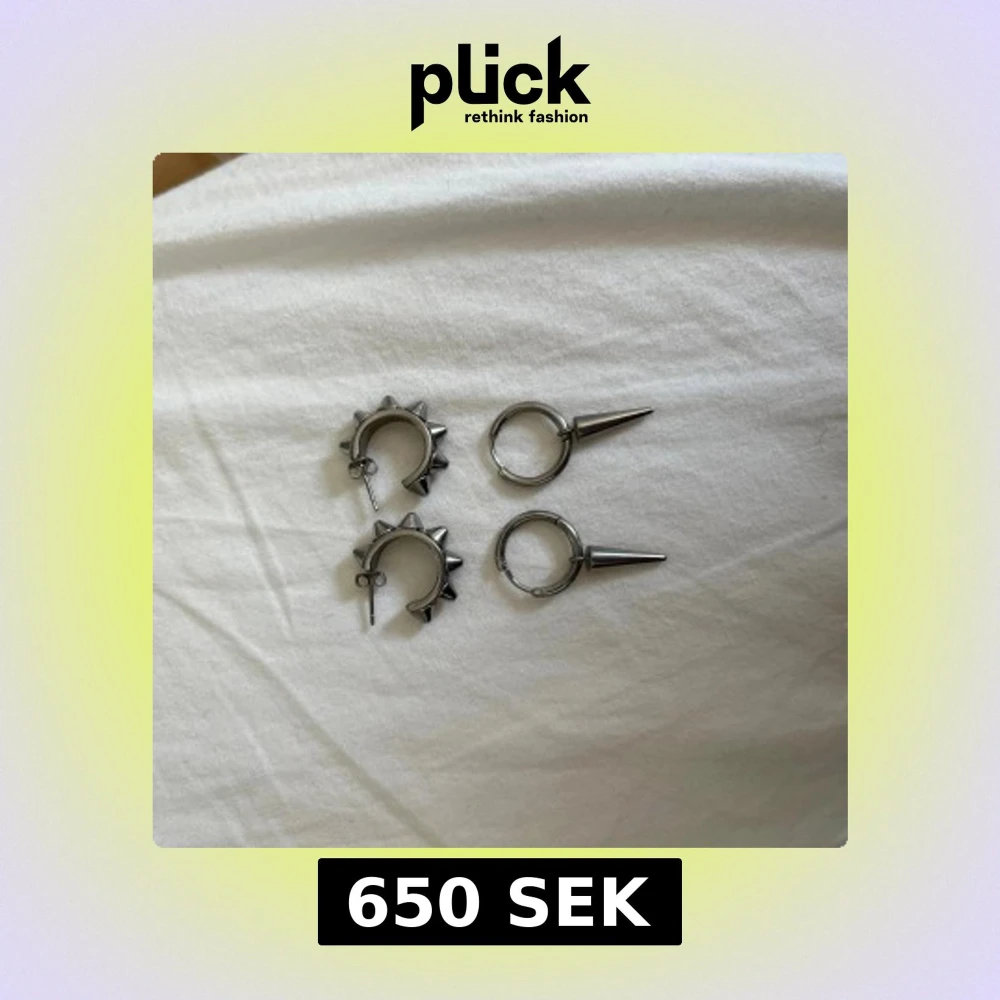Säljer två par silvriga örhängen från edblad. Ett par är hoops med spetsiga konformade spikes, det andra paret är hoops med flera små nitar runt hela ringen. Säljer de i andra annonser så man kan köpa var för sig