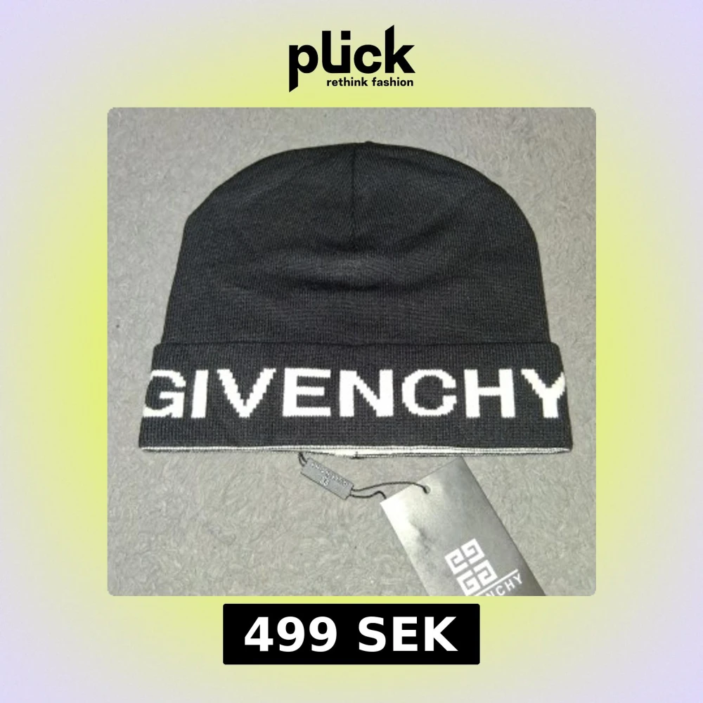 Svart mössa från Givenchy med vit, stor logotyp broderad runt uppviket. Mössan är stickad och har en insida i vitt. Perfekt för dig som vill ha en clean och lyxig accessoar med streetkänsla.