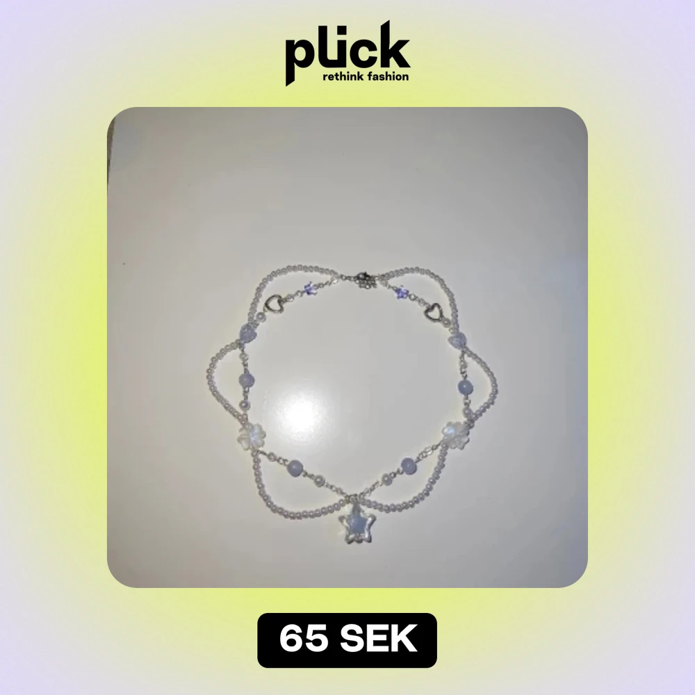 Handgjort halsband av mig, med mesta dels plast pärlor och några glas pärlor. Halsbandet tog ganska lång tid att göra men kan ändå diskutera priset om någon vill de🩷 Halsbandet är i vitt och blått🤍🩵