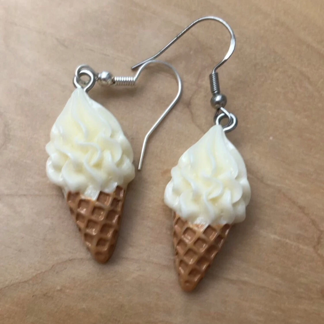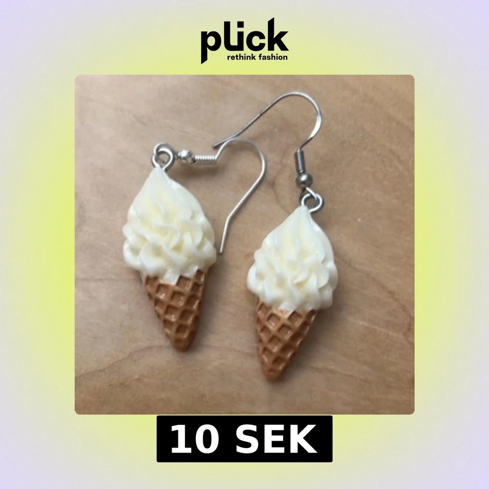 Roliga örhängen formade som glassar i strut med vit glass och ljusbrun våffla. Perfekta för dig som vill sticka ut och addera en lekfull touch till din stil. Hängande modell med metallkrok. Priset gäller för ett par örhängen (de i bilden) men det finns 3 par i lager (de i bilden inkluderade) så man kan köpa alla tre för 20kr💞
