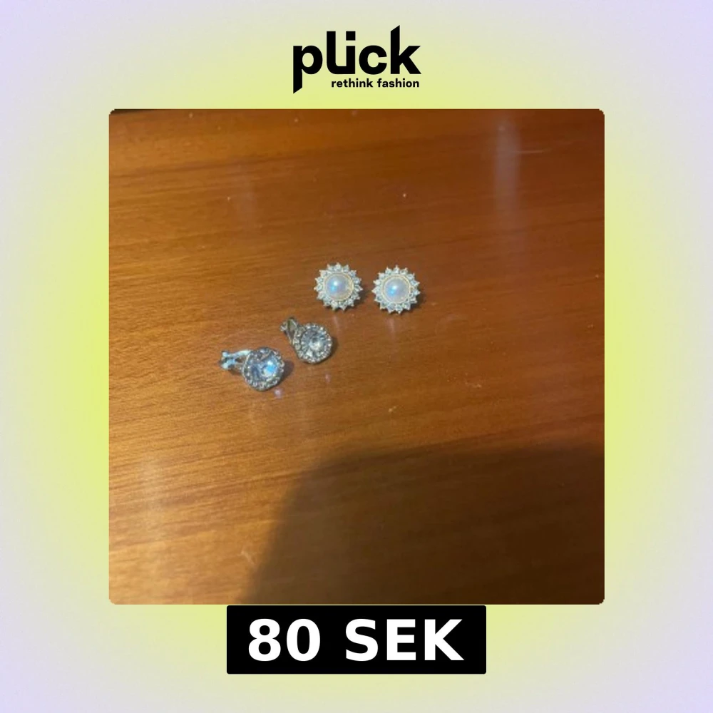 Säljer två par örhängen, ett par med vita pärlor omgivna av små glittrande stenar i solformad design och ett par med stora runda klara stenar i silverfärgad infattning. Perfekt för dig som gillar bling och klassisk stil. Dem är använda en gång var, annars fullt nya!