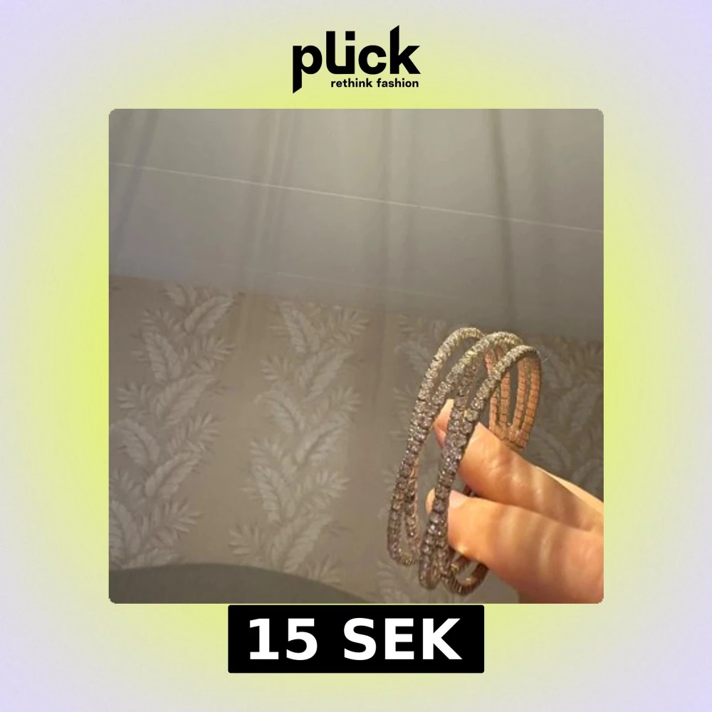 Säljer ett snyggt armband i silverfärg med tre rader av gnistrande stenar. Armbandet har en böjbar form som gör det lätt att ta på och av. Perfekt för dig som gillar att sticka ut med lite extra bling och vill ha något som verkligen fångar ljuset.