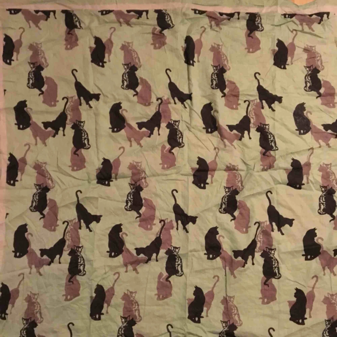Grön sjal med kattmotiv. 1x1 meter stor. Sjalen är i bra skick och har endast använts ett fåtal gånger