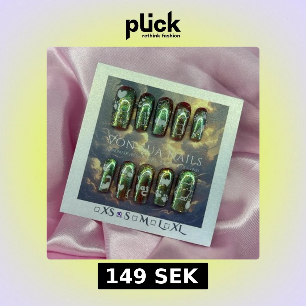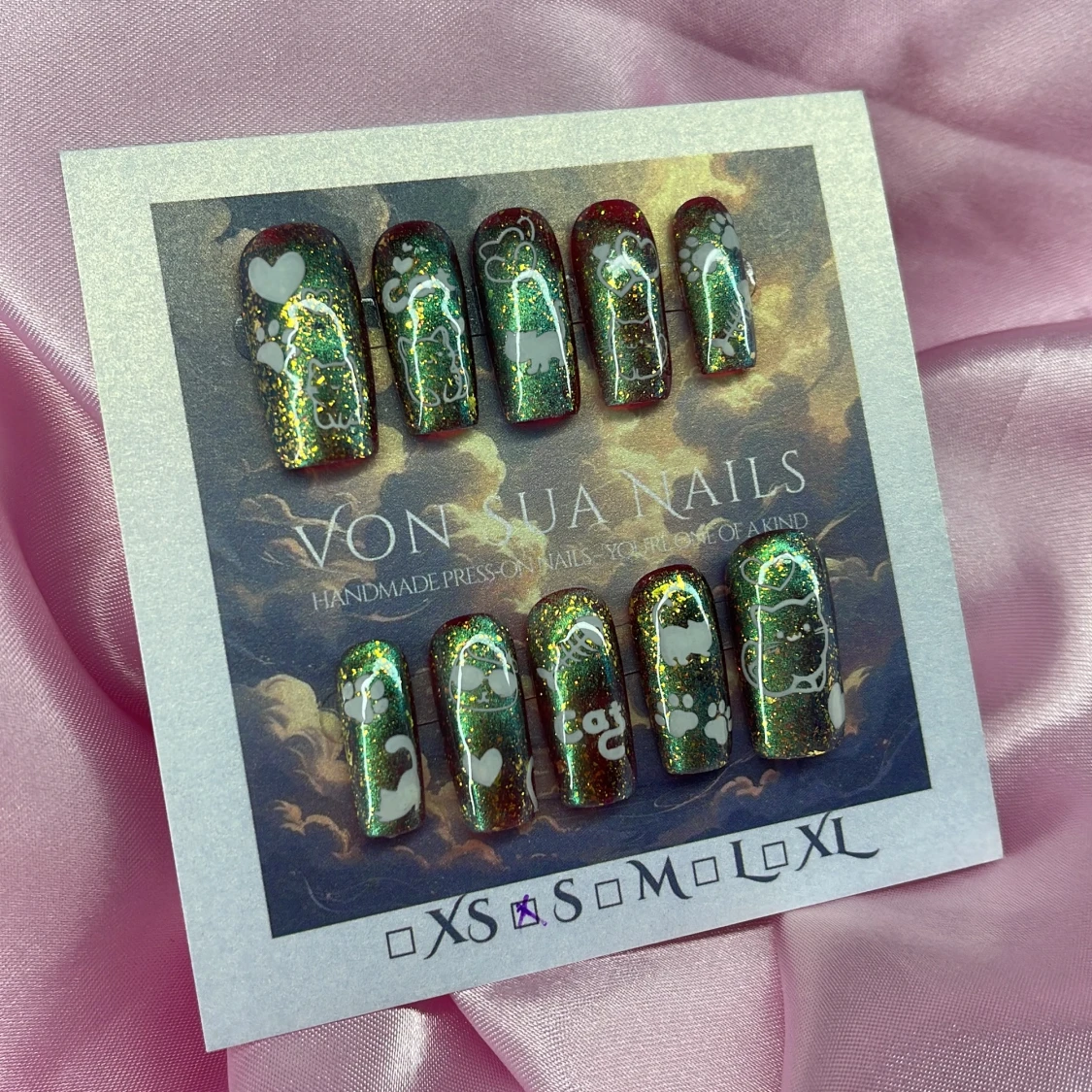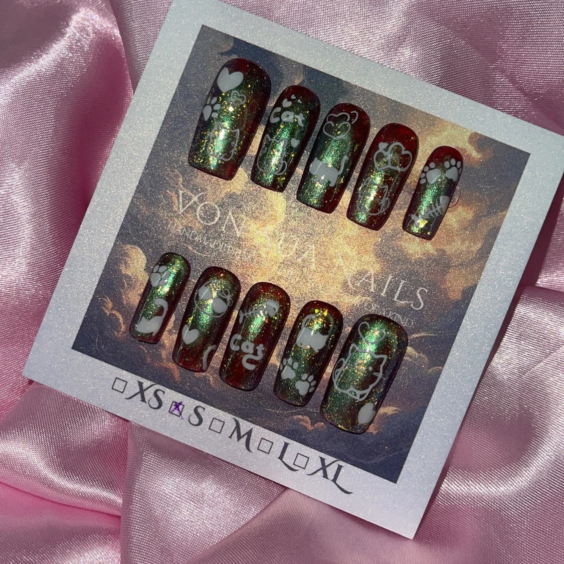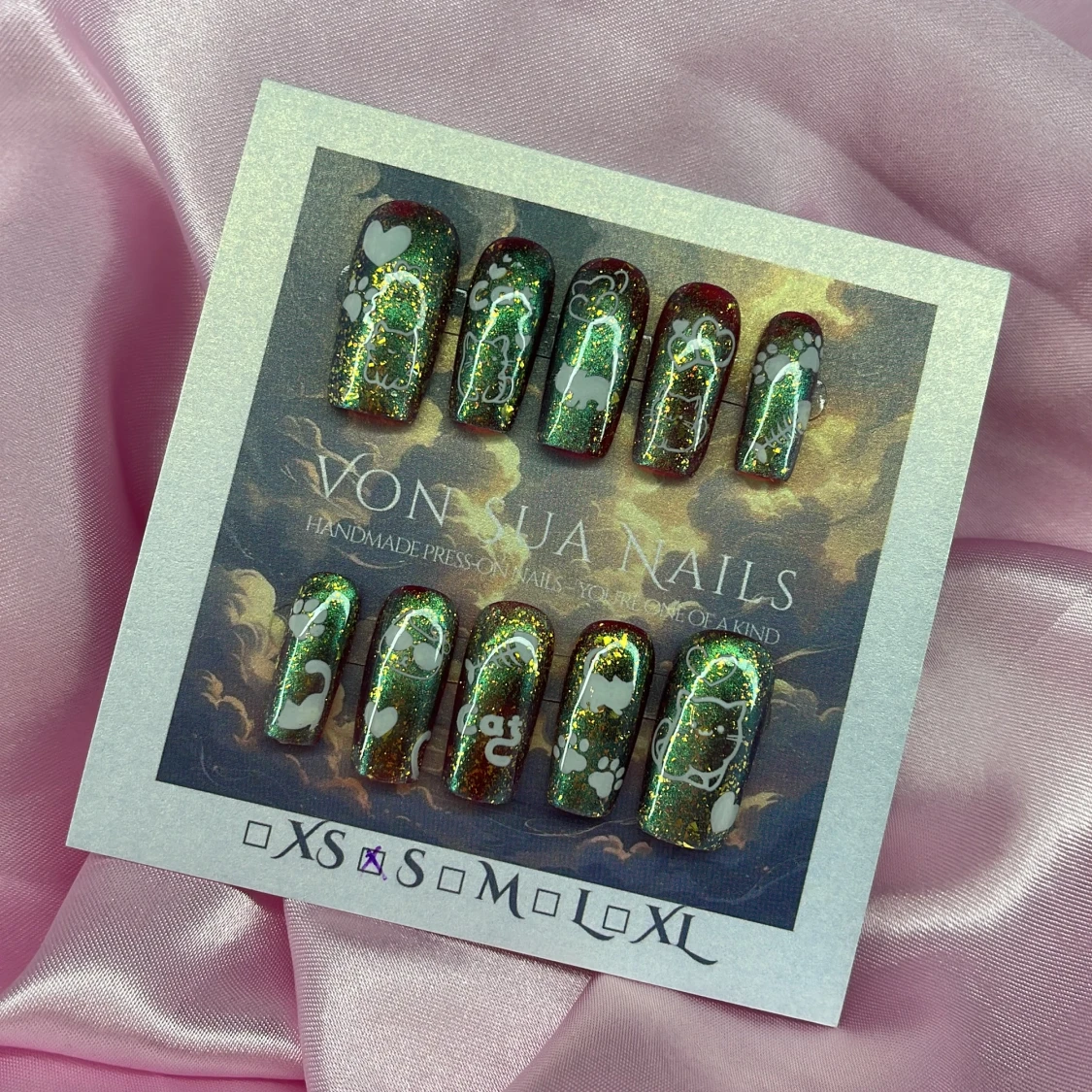 Handgjorda press-on naglar med grön och röd glitterbas, dekorerade med vita kattmotiv (lyser i mörket), tassar, hjärtan och texten 'cat'. Naglarna har en medium square form och finns i storlek S: 15 mm, 11,5 mm, 12 mm, 11 mm, 9 mm , enligt storlekstabellen. Perfekt för dig som vill ha unika och lekfulla naglar.
