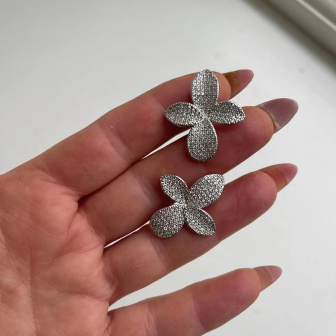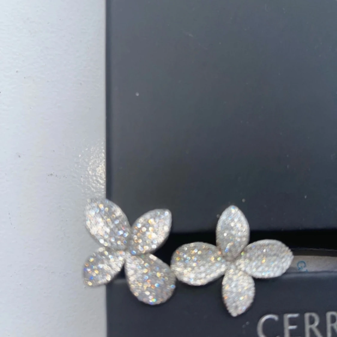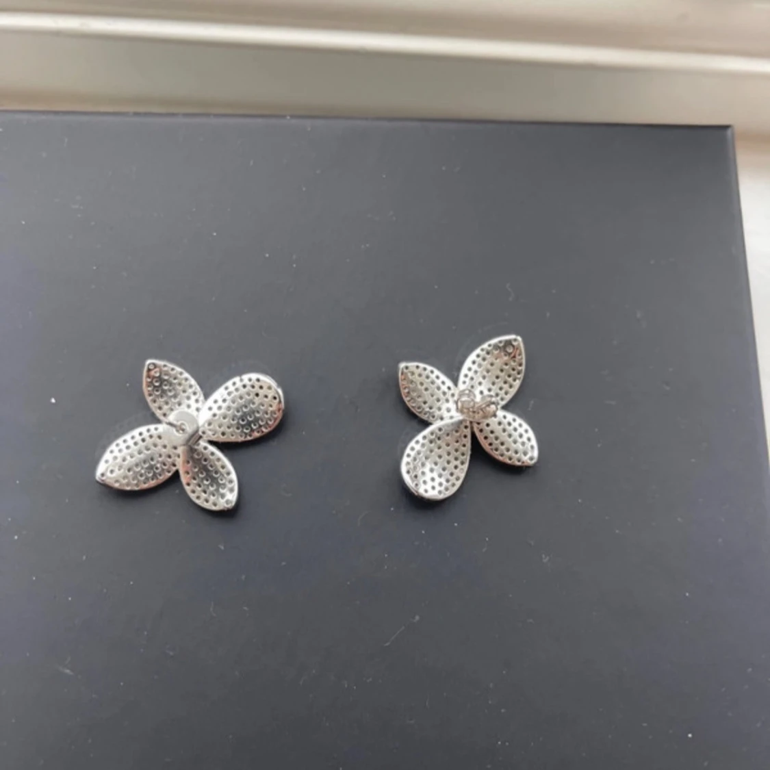 Säljer ett par superfina örhängen i form av blommor. De är i silverfärg och täckta med glittriga stenar som verkligen fångar ljuset. Perfekta för att ge lite extra bling till din outfit, oavsett om det är till fest eller vardag. De är i mycket bra skick och redo att bäras av någon som älskar att glittra!