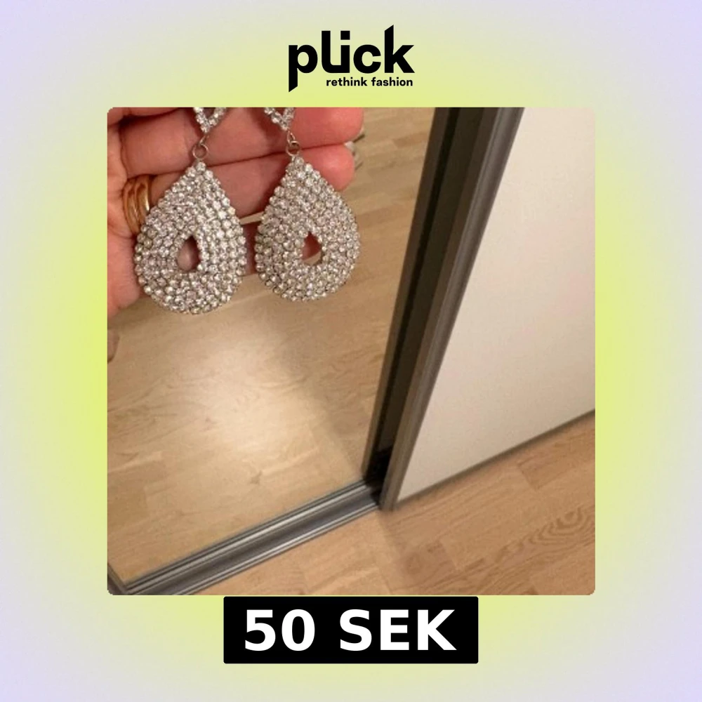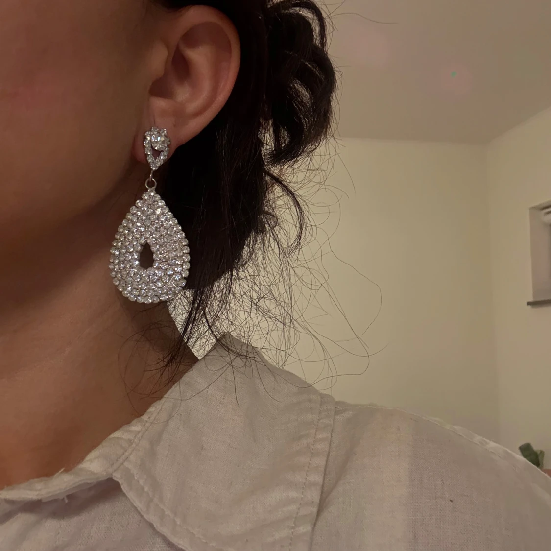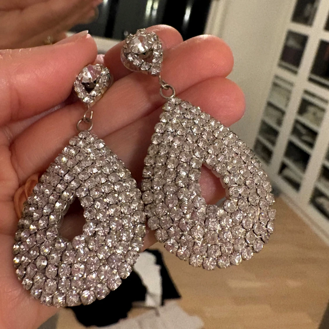 Säljer ett par stora, droppformade örhängen i silverfärg med massor av glittrande stenar. De har en öppen mitt och är riktigt statement med sitt gnistrande utseende. Perfekta för att lyfta din look och ge extra bling. Använd 1 gång