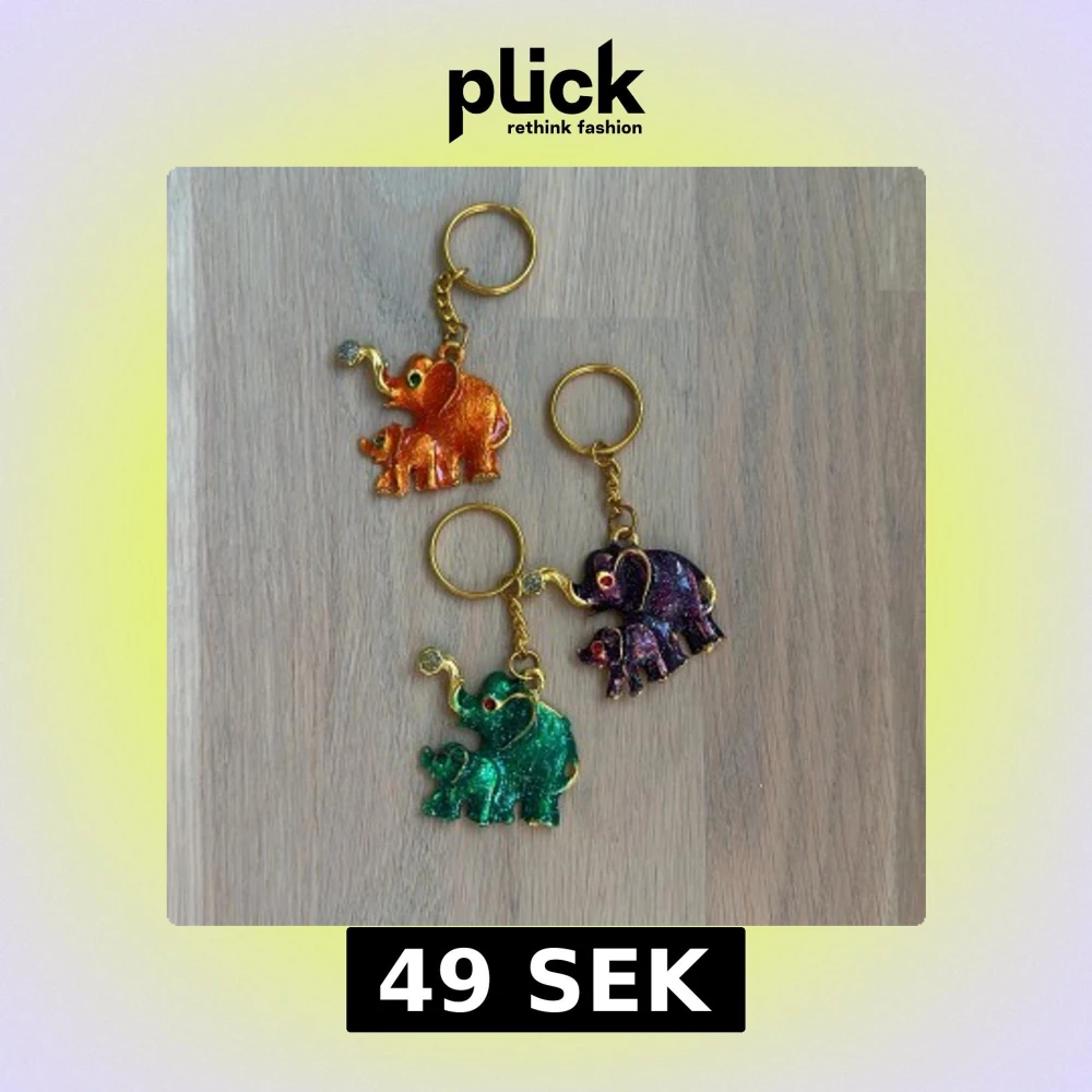 Tre färgglada nyckelringar med glittriga elefanter i orange, grön och lila. Varje nyckelring har två elefanter, en stor och en liten, med guldfärgade detaljer och gnistrande ögon. Perfekt accessoar för att piffa upp nyckelknippan eller väskan. Alla för 49❤️ en för 19❤️