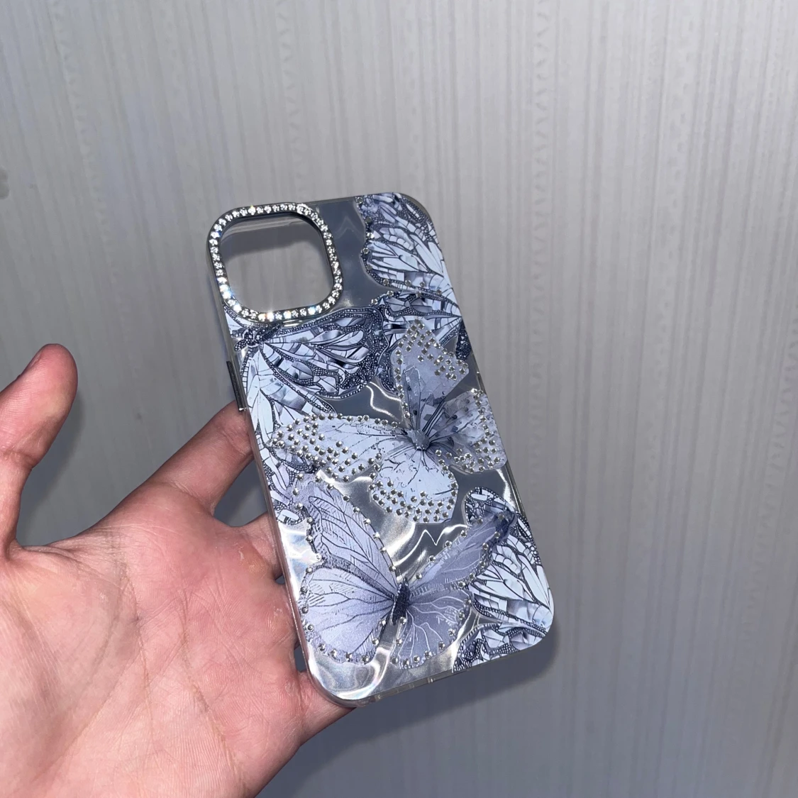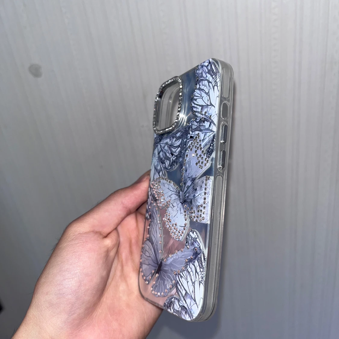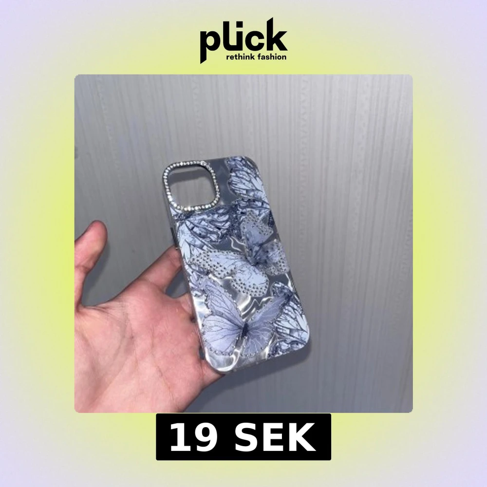 Passar iphon 13normal och 14normal En för 19kr och två för 35kr Oanvänd Snyggt mobilskal med transparent bas och stora blå-lila fjärilar. Skalet är dekorerat med glittriga stenar runt kamerahålet och på fjärilarna för extra bling. Perfekt för dig som vill ha en unik och trendig look på mobilen.
