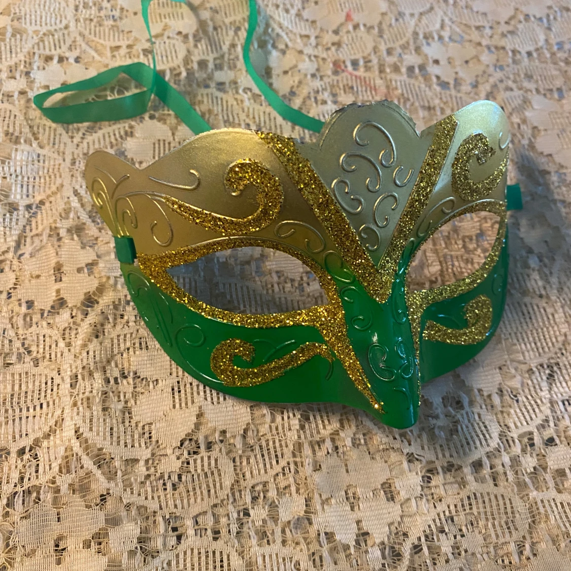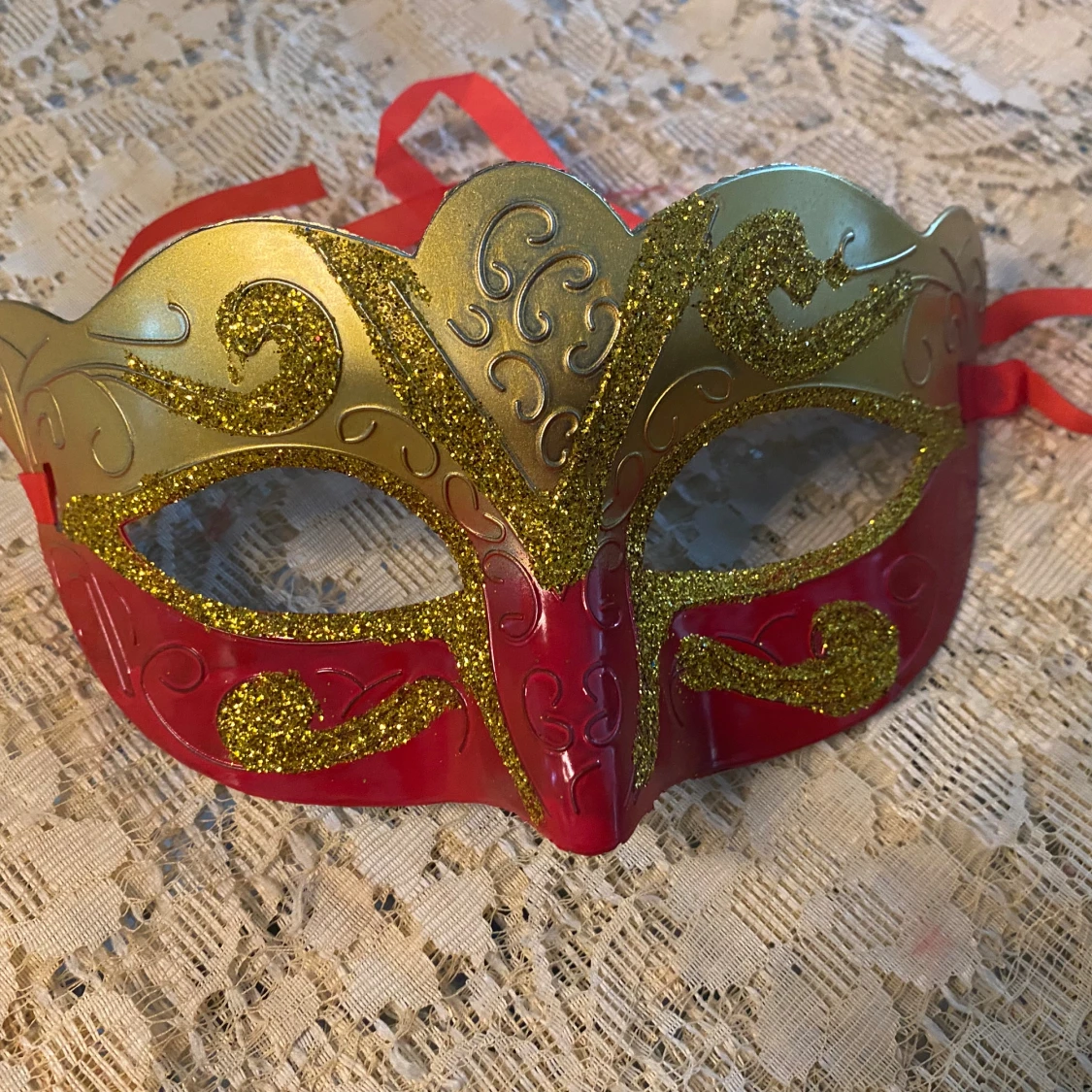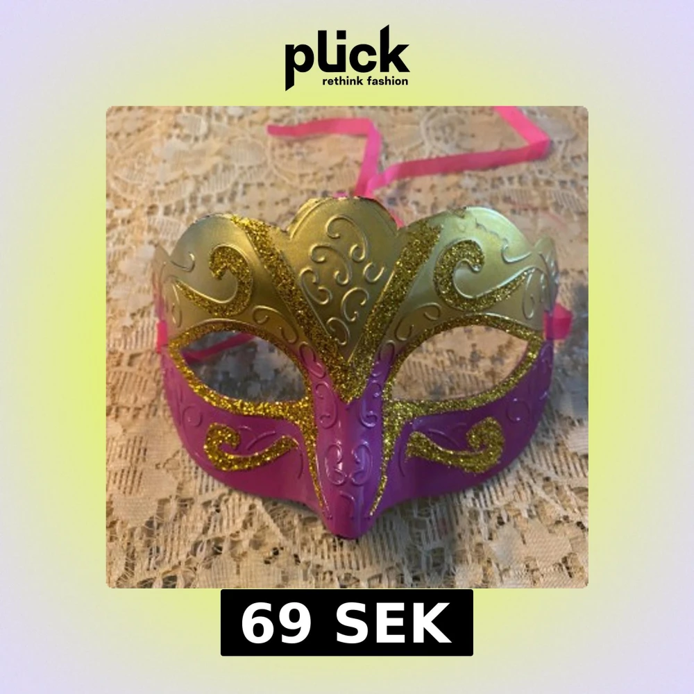 Säljer tre snygga maskeradmasker i plast med metallic guld upptill och glittriga detaljer. Finns i rosa, röd och grön med matchande band att knyta. Perfekt för maskerad eller bal, med coola snirkliga mönster och skimrande finish. 69kr/st