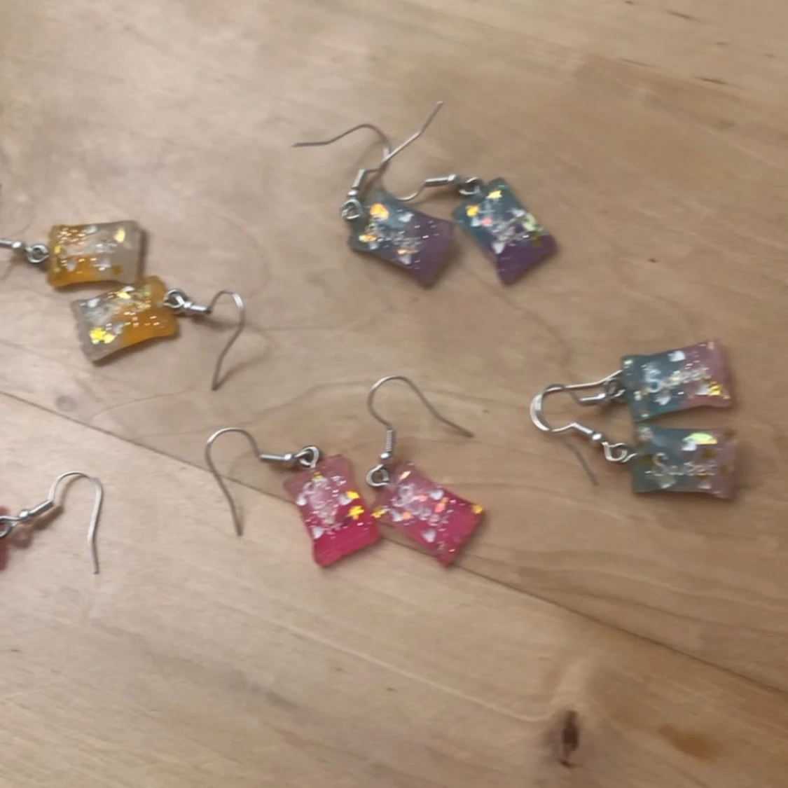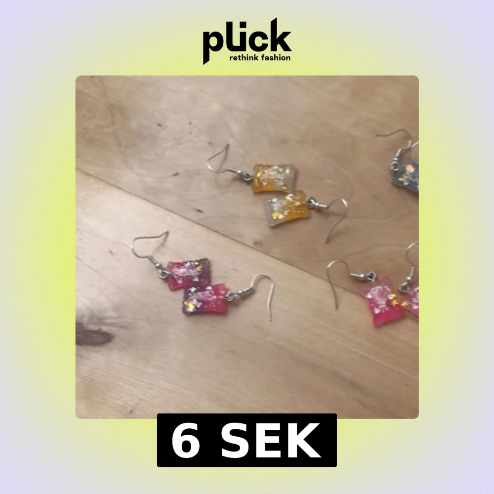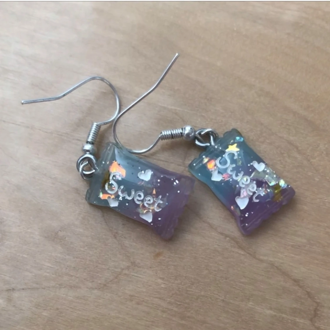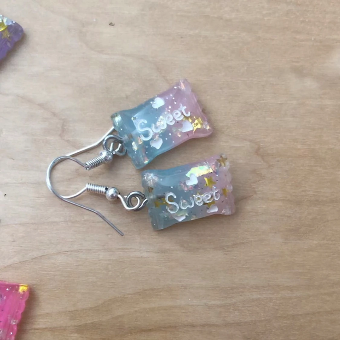 Färgglada örhängen med glittriga detaljer och texten 'Sweet' på varje hänge. Finns i flera färger som gult, lila, rosa och blått, dekorerade med små hjärtan och stjärnor. Perfekta för dig som vill sticka ut med ett lekfullt och unikt smycke. Det finns ett par av alla förutom de blå-rosa (2 par), de vit-gula (2par) och de rosa-lila (2 par). Priset gäller för ett par örhängen men man kan även köpa alla 8 par för 28kr💞