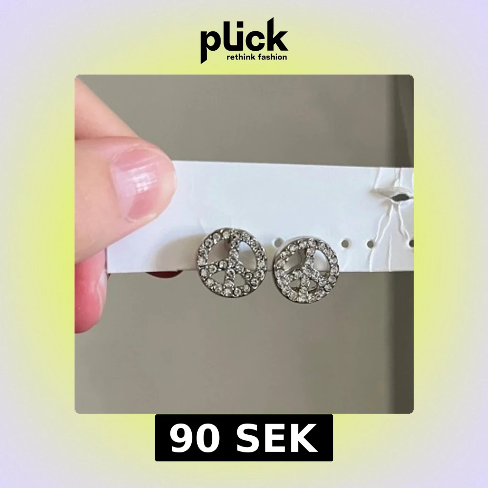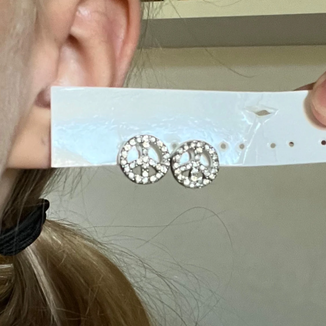 Säljer ett par snygga örhängen i form av peace-symboler, täckta med glittrande stenar. Färgen är silver och de är riktigt blingiga, så du syns garanterat!