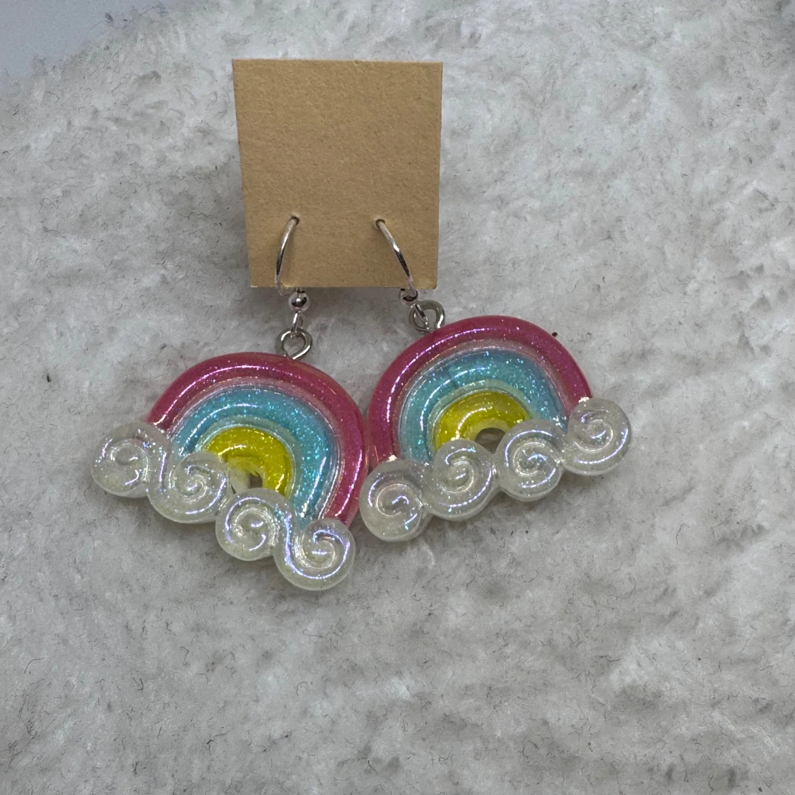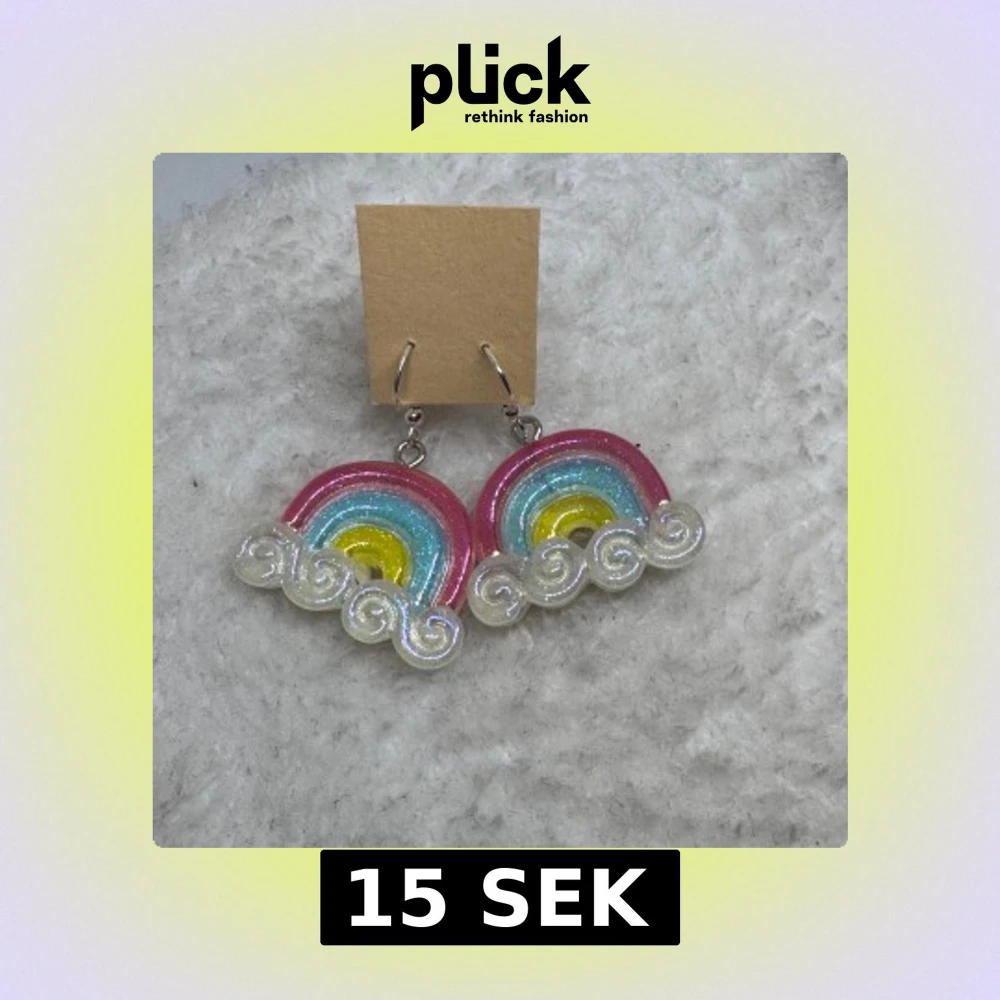 Färgglada örhängen i form av regnbågar med glittriga moln. Örhängena har rosa, blå och gul färg med skimrande detaljer som gör dem extra iögonfallande. Perfekt för dig som vill sticka ut och sprida good vibes.
