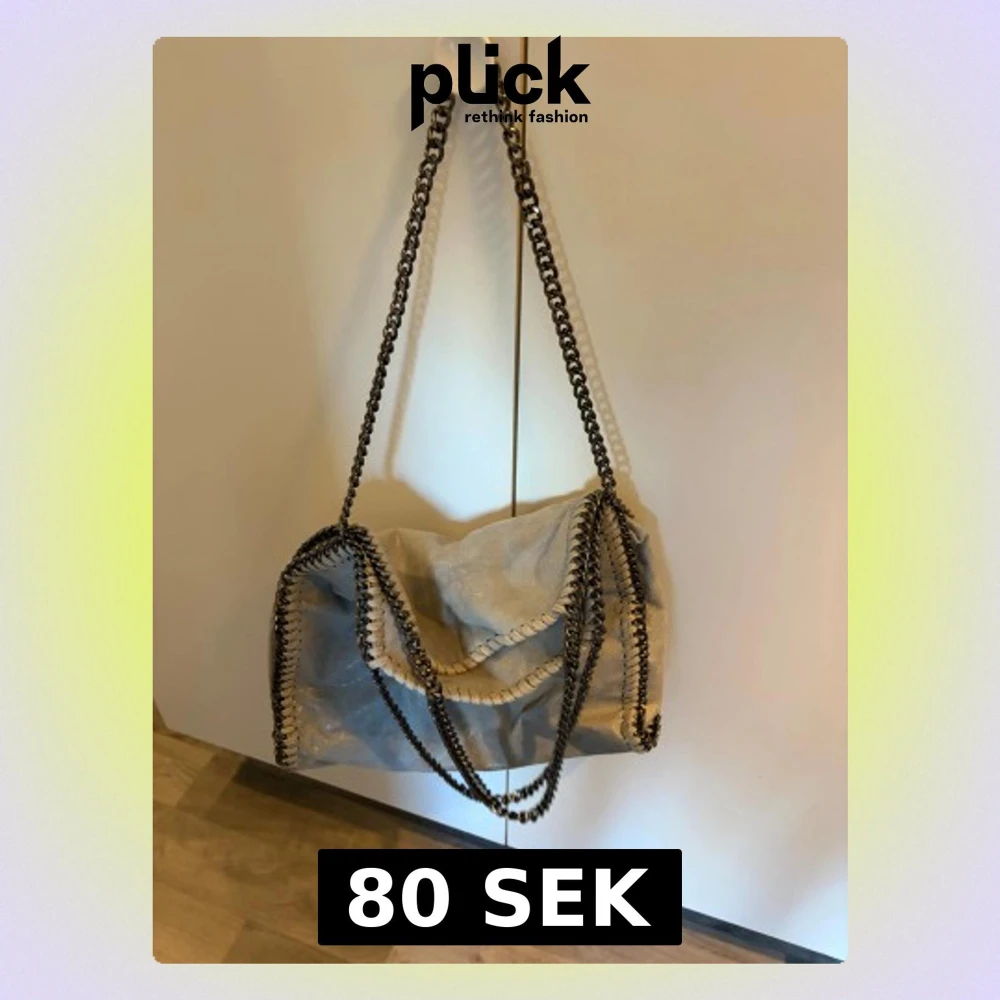 Snygg grå axelväska från Stella McCartney med glansig mockayta och kraftiga kedjor som axelrem. Insidan har leopardmönstrat foder och en praktisk innerficka med dragkedja. Perfekt för dig som gillar coola detaljer och vill sticka ut.